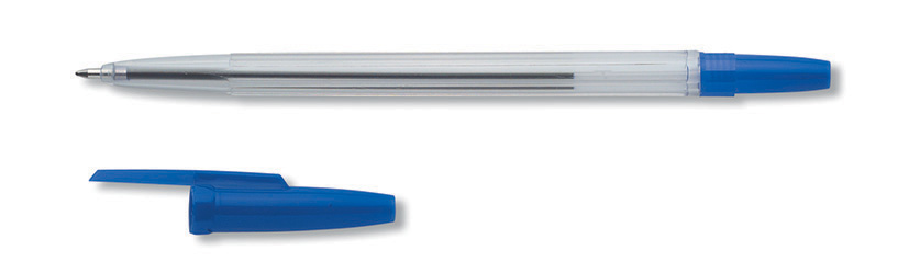 Jednorázové plastové kuličkové pero s průhledným tělem pro kontrolu množství náplně. Hrot 1,00 mm. Barva náplně: modrá.
