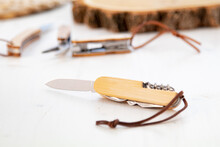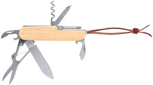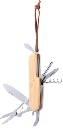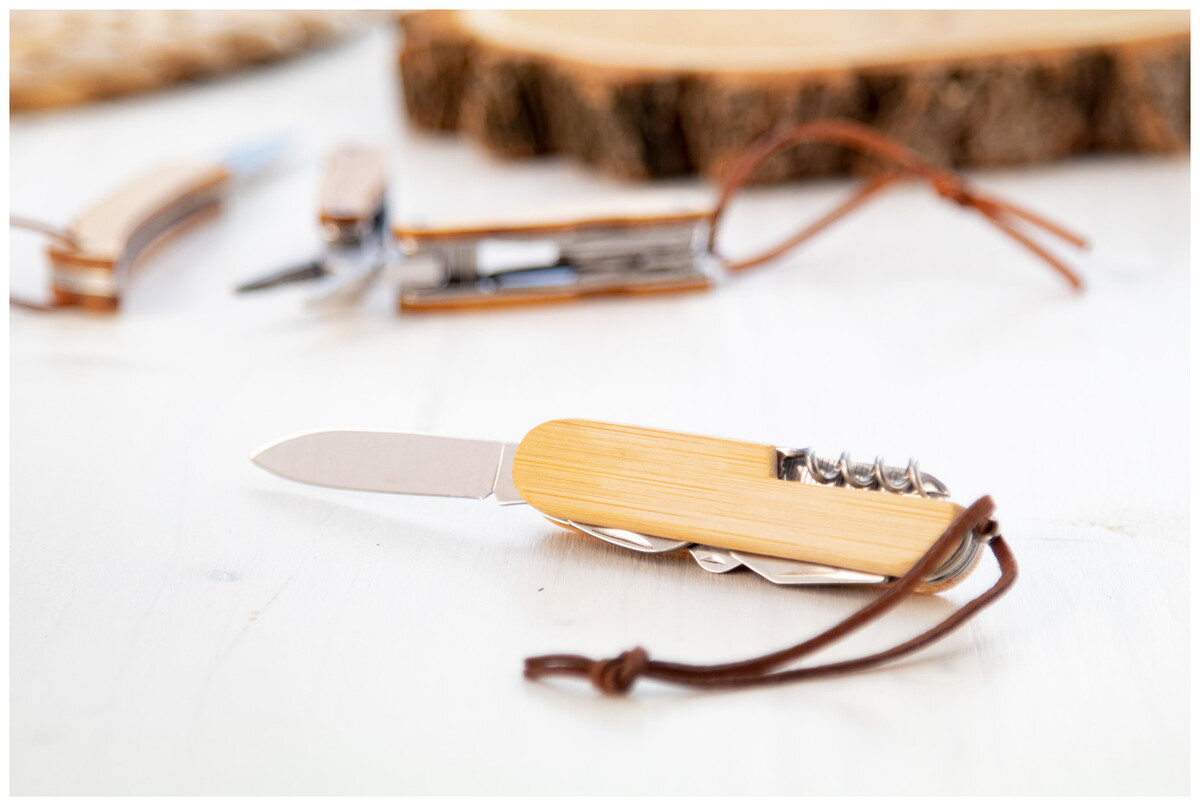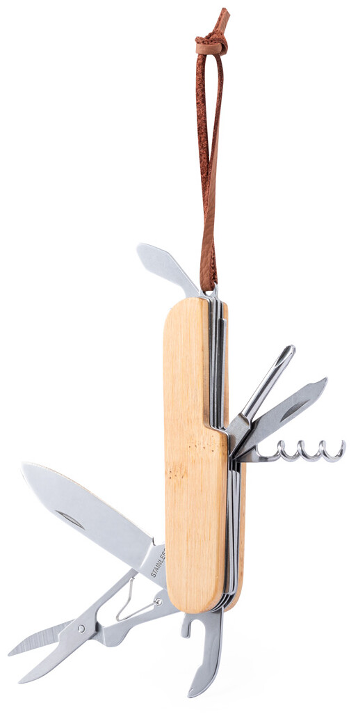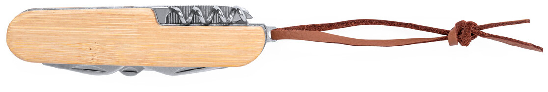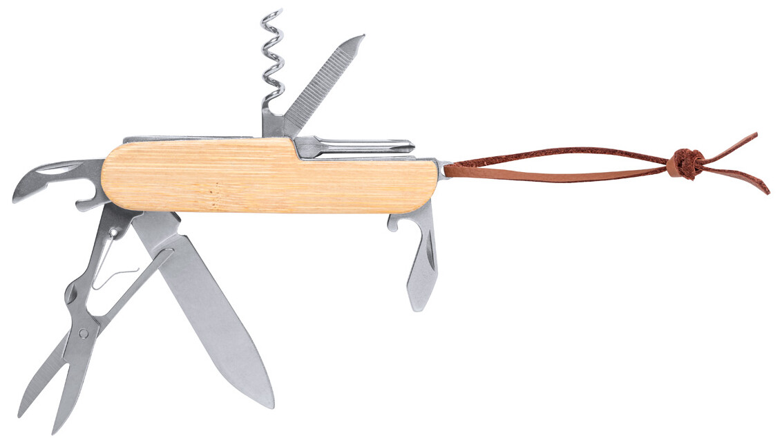 Kapesní nůž z nerezové oceli s bambusovou rukojetí a 9 funkcemi. S pákem z PU kůže.