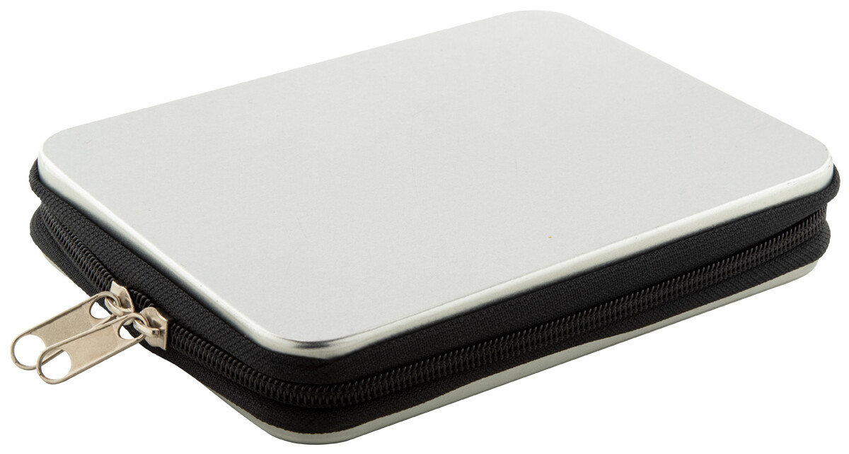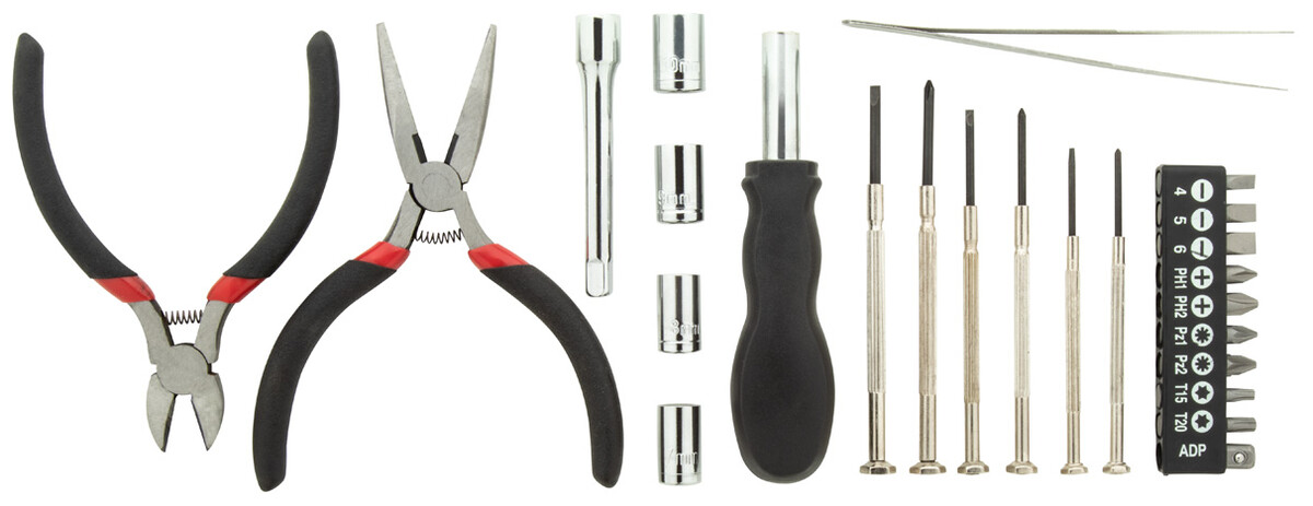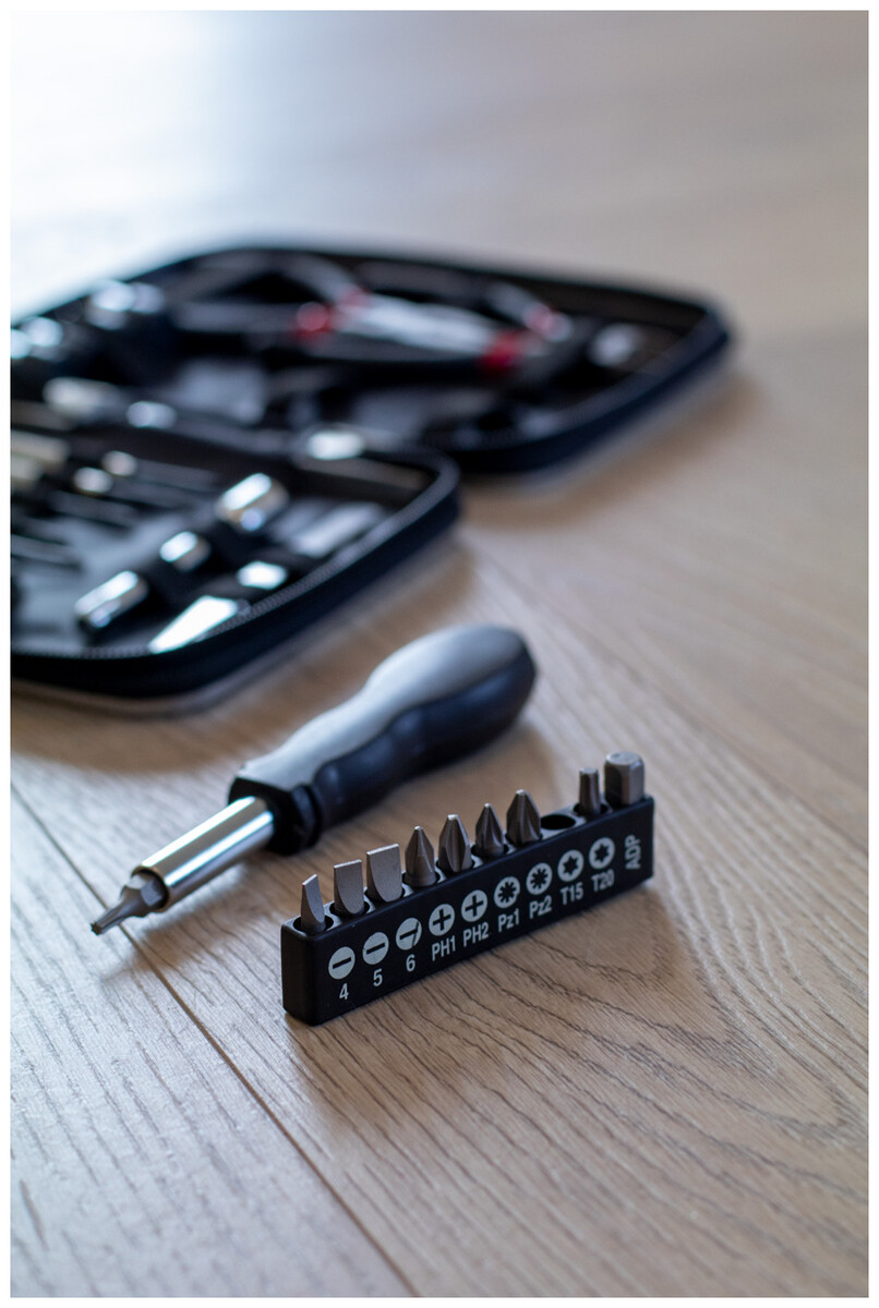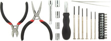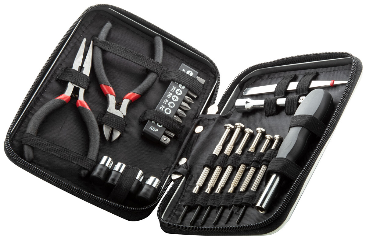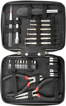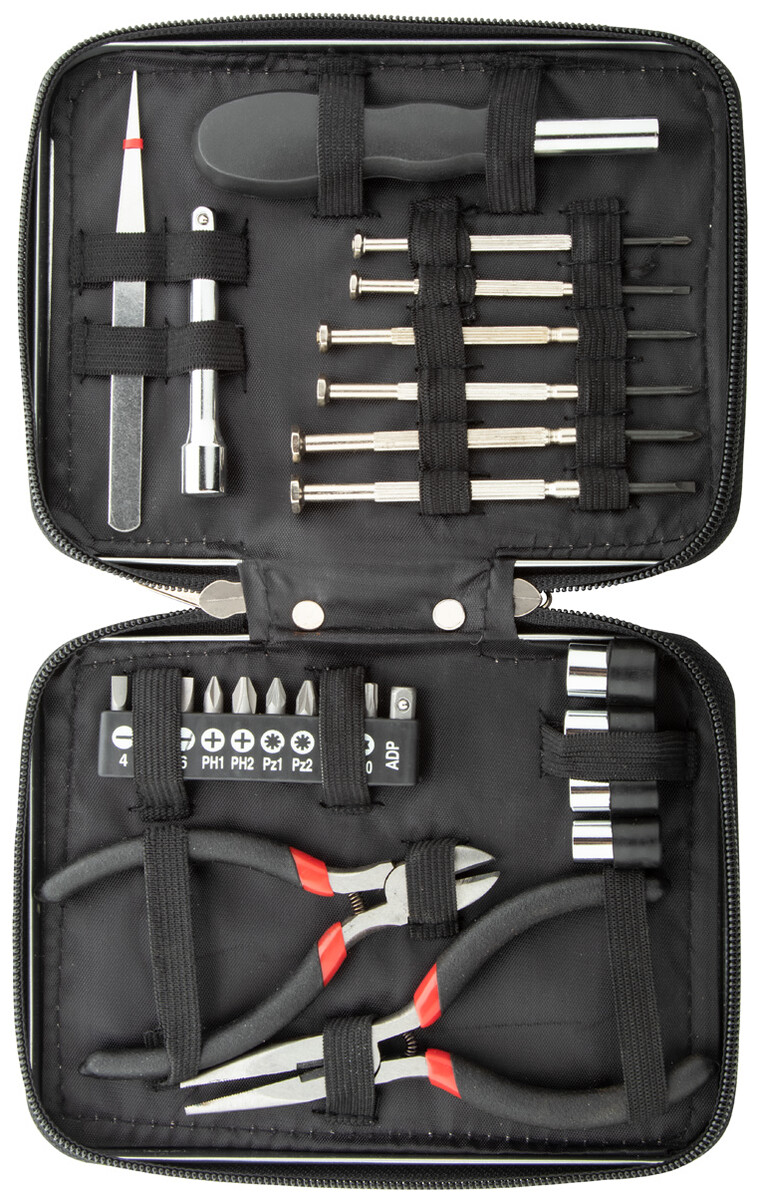 25 ks kovová sada nářadí v hliníkovém pouzdře na zip. Obsahuje: dlouhé kleště, štípací kleště, nástrčný šroubovák, nástavec, pinzeta, 6 přesných šroubováků, sada nástrčných klíčů 4 ks, sada 10 ks bitů na šroubovák.