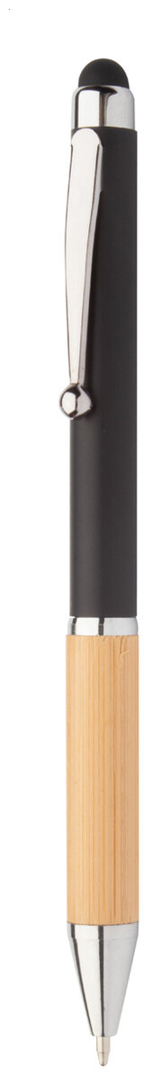 Plastové otočné kuličkové a dotykové pero s bambusovým úchopem, kovovým tělem a lesklými chromovanými částmi. S modrou náplní.