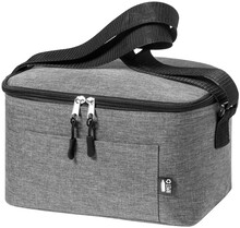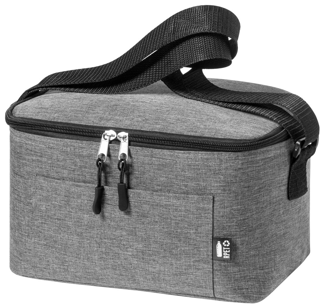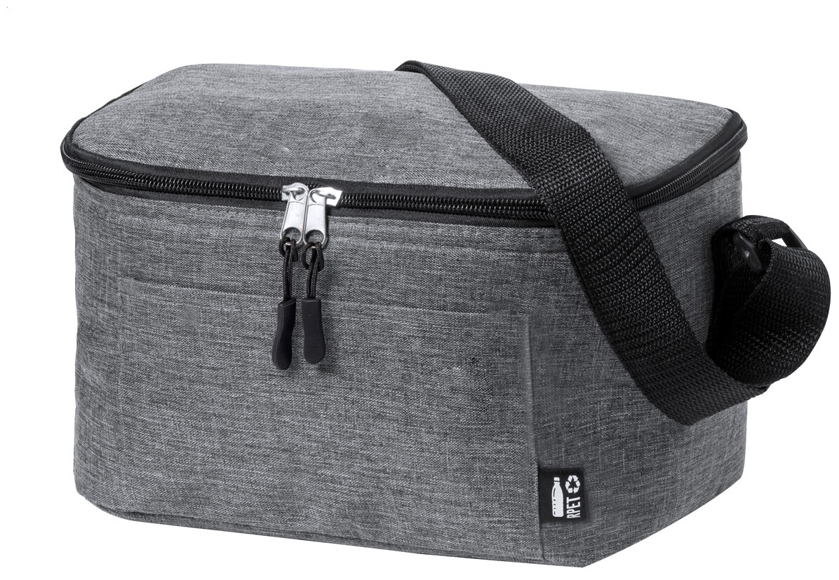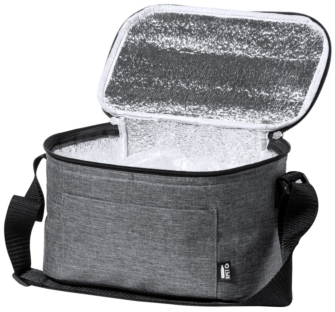 Chladící taška na zip z RPET s hliníkovou vložkou, pro 6 ks 0,33L plechovek. S přední kapsou a nastavitelným ramenním popruhem. 600D RPET polyester s výrazným štítkem RPET.