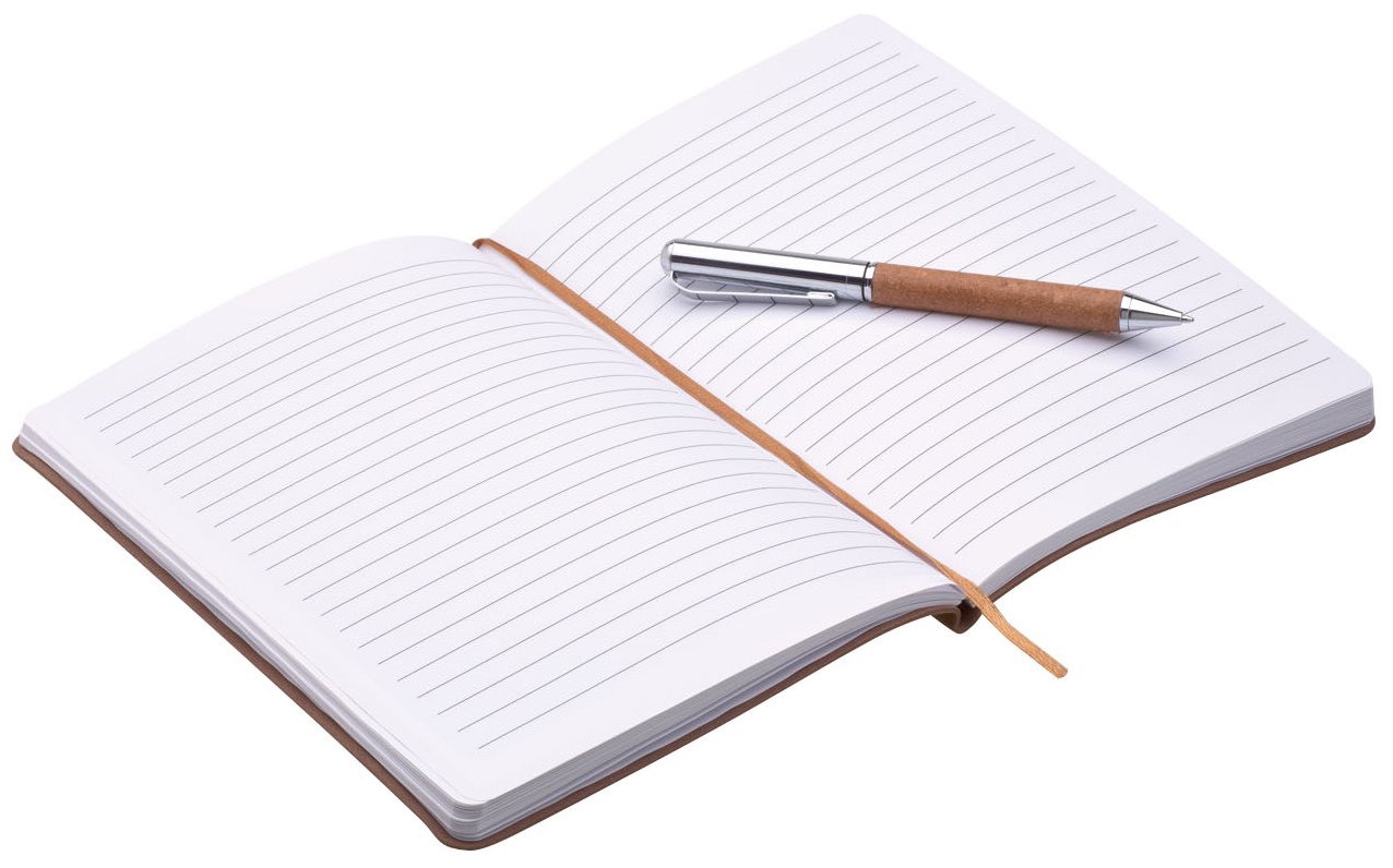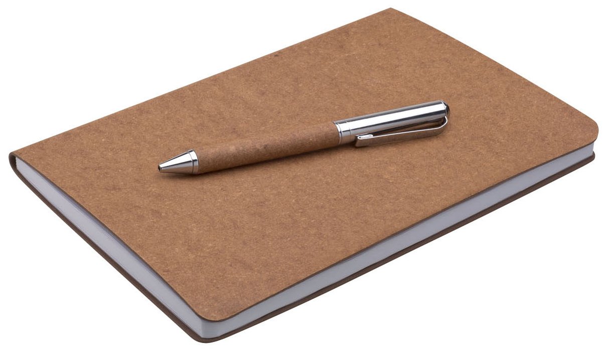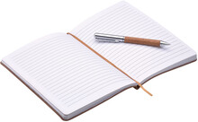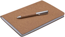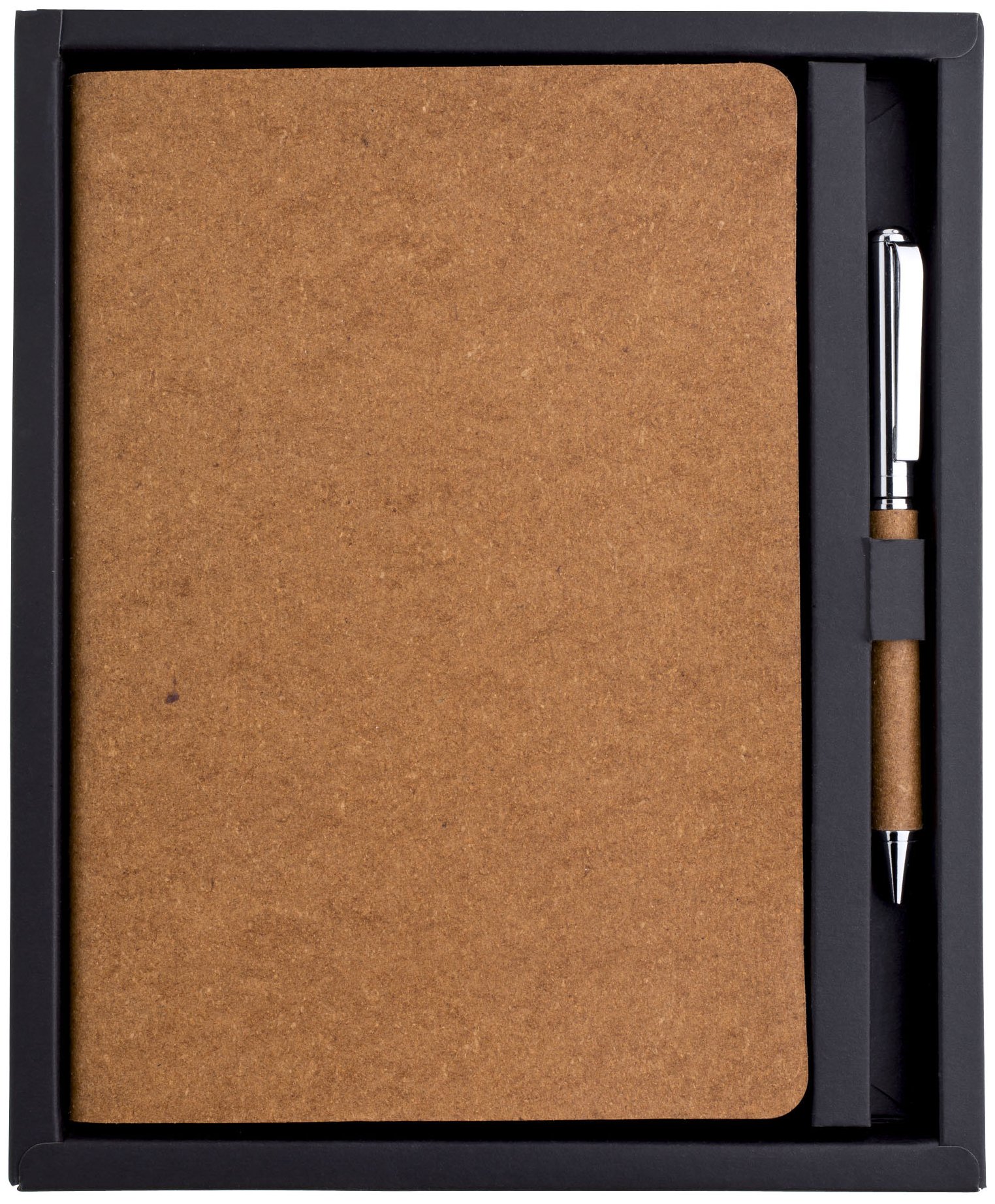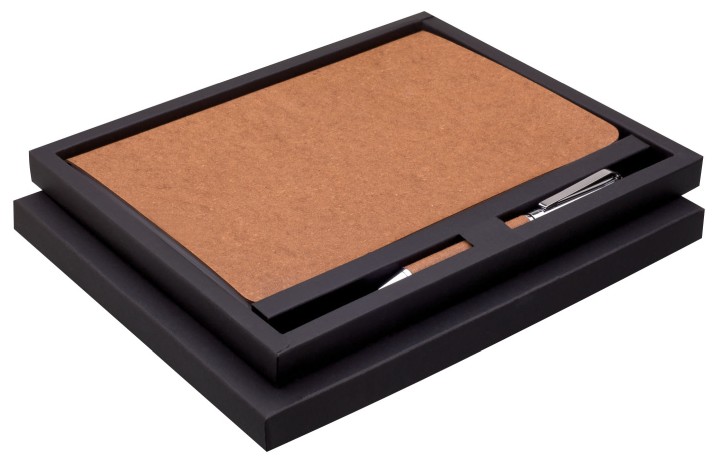 Poznámkový linkovaný blok, zápisník v deskách z recyklované kůže s kovovou propiskou v černé dárkové krabičce.