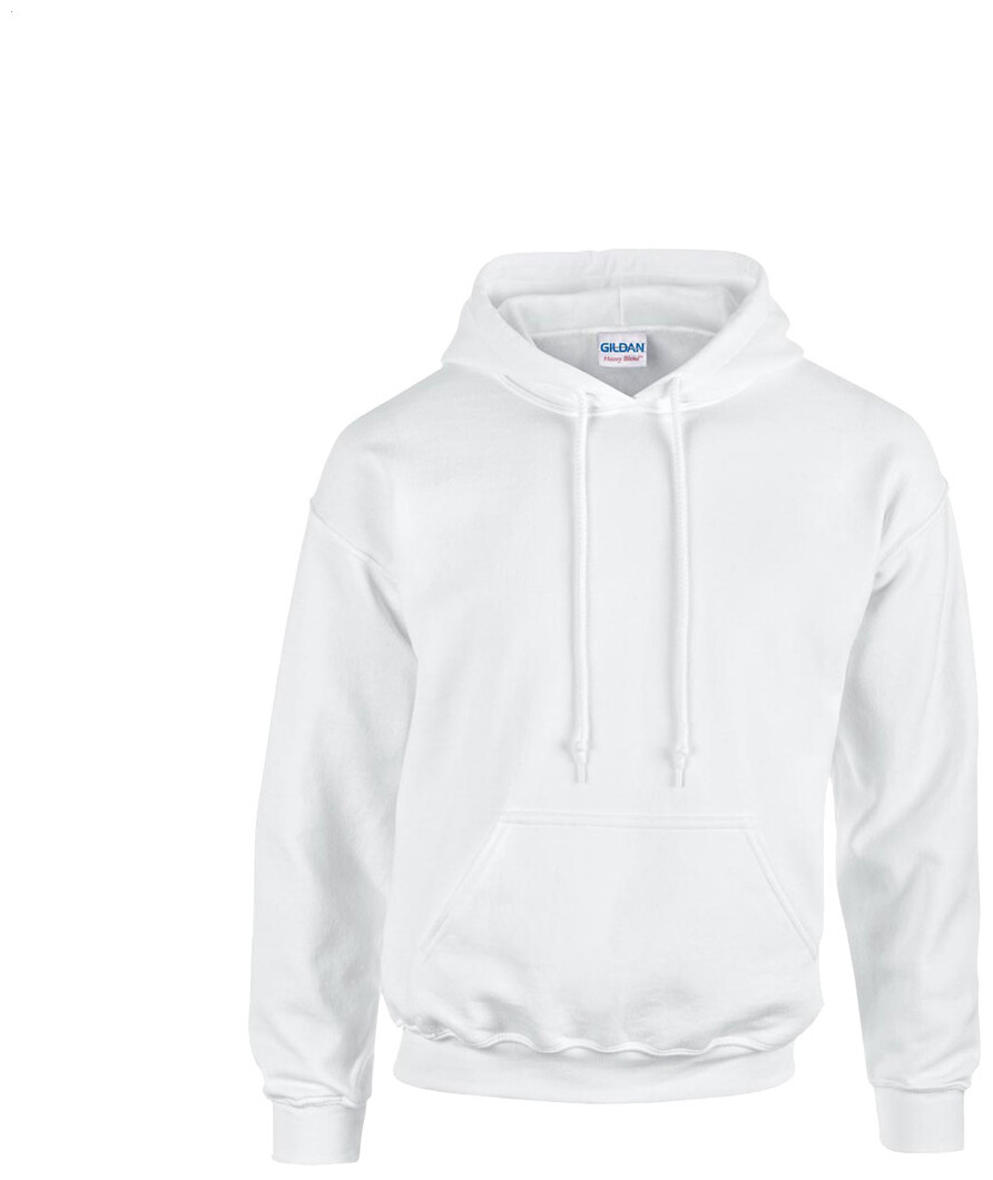 Mikina s kapucí z 50% bavlny a 50% polyesteru s přední kapsou. 271 g/m2 (bílá 257 g/m2). Produkt značky Gildan.