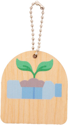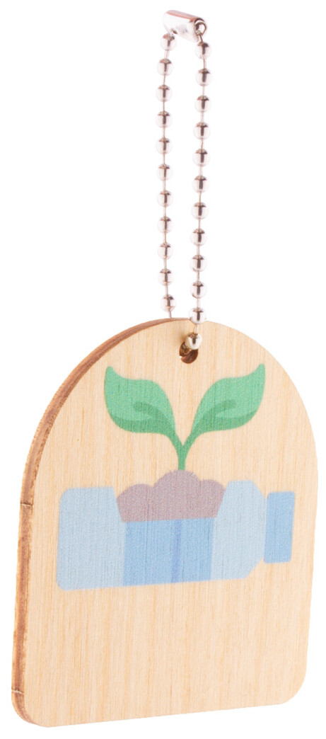 Přívěsek na klíče z březové překližky s kovovým řetízkem a motivem ochrany životního prostředí.