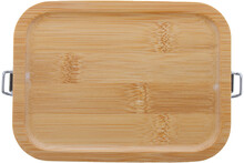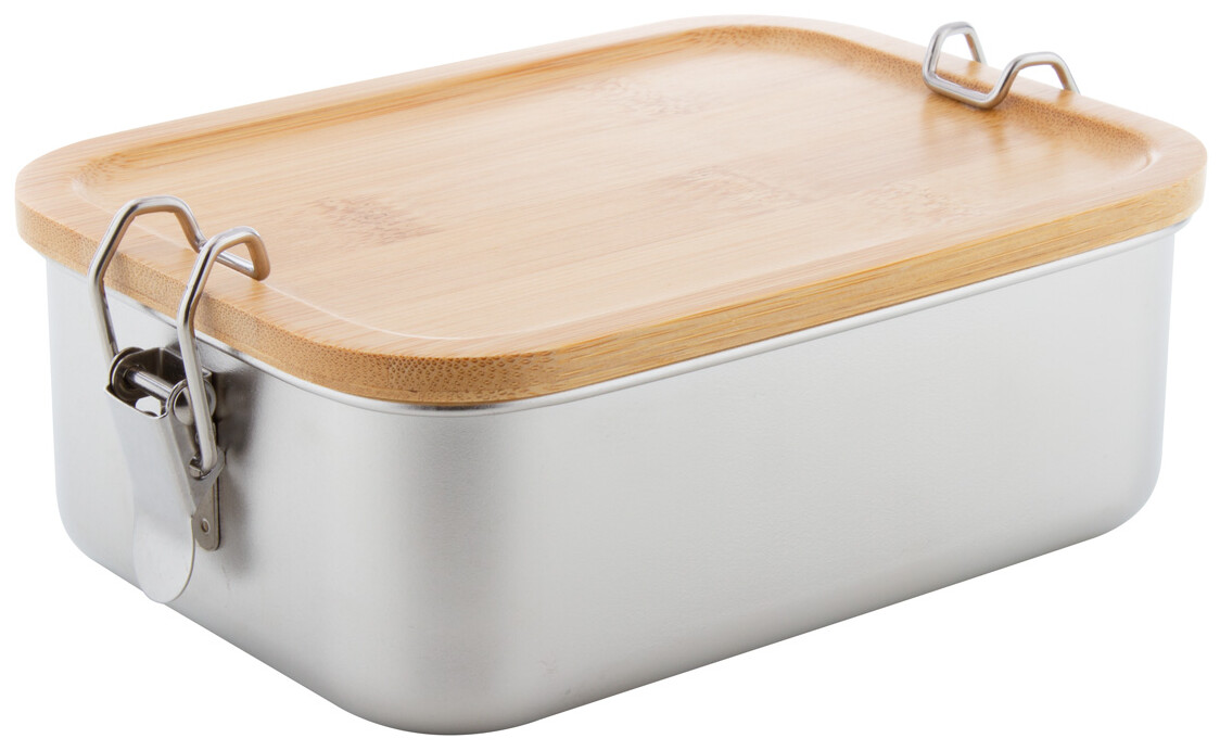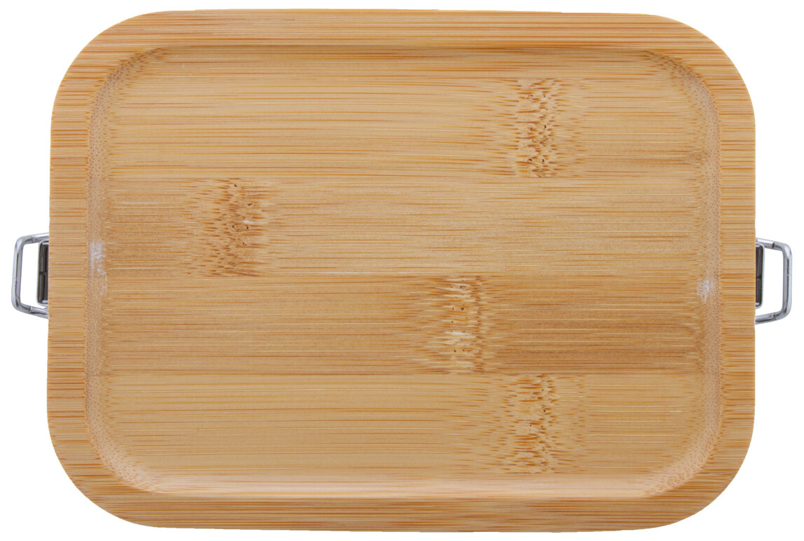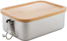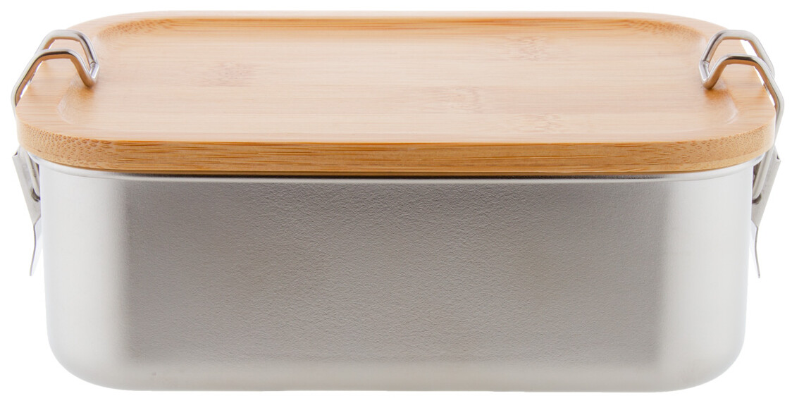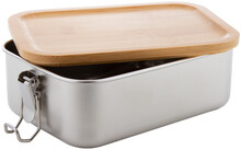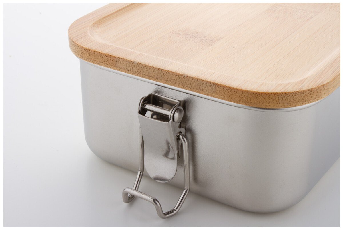 Nerezový box na jídlo s bambusovým víkem a bezpečným zavíráním na přezku, 750 ml.