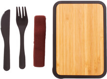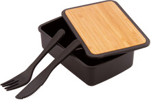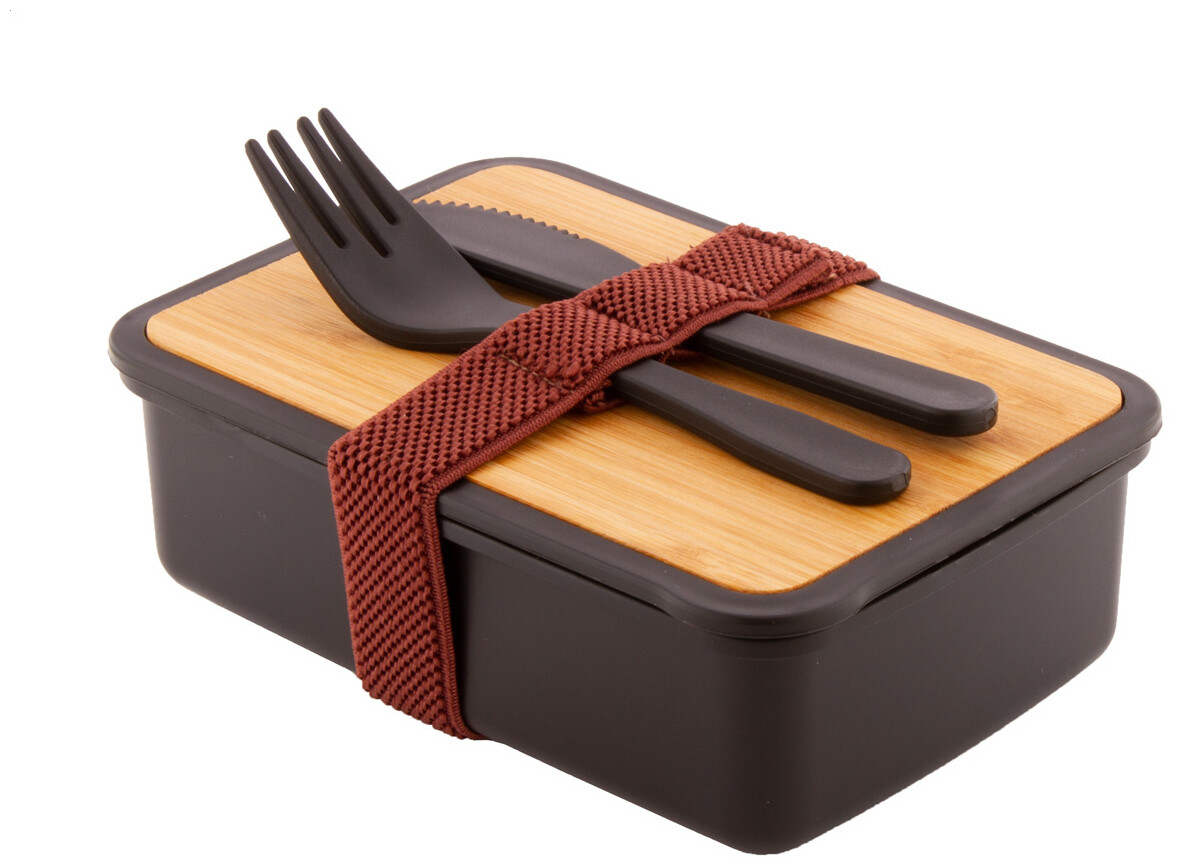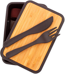 Box na jídlo z recyklovaného PP plastu s bambusovým víkem, sadou příborů (nůž a vidlička) a elastickým páskem. 500 ml.