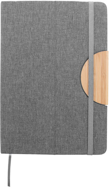 Blok A5 s deskami potaženými polyesterem RPET s bambusovou vložkou a funkcí držáku na mobil. S 80 linkovanými listy z recyklovaného papíru, záložkou a gumičkou.