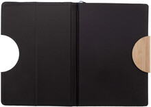Blok A5 s deskami potaženými polyesterem RPET s bambusovou vložkou a funkcí držáku na mobil. S 80 linkovanými listy z recyklovaného papíru, záložkou a gumičkou.