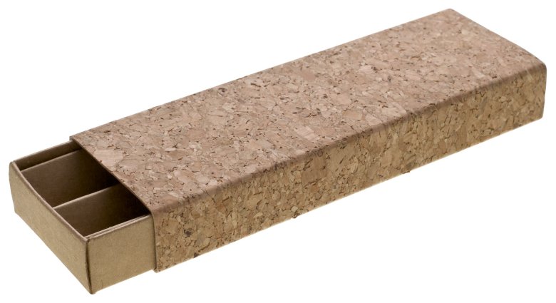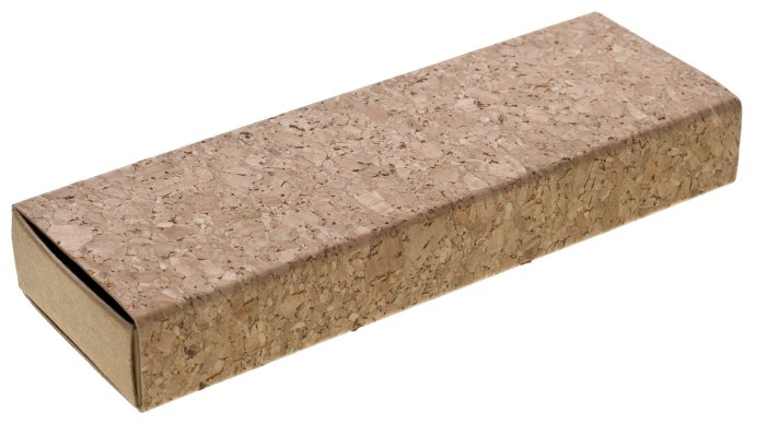 Krabička na 2 propisky z recyklovaného papíru v korkovém přebalu.