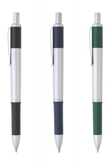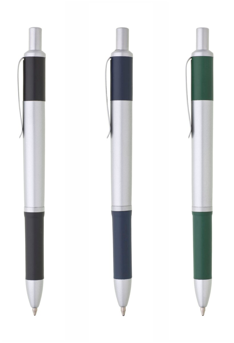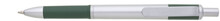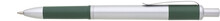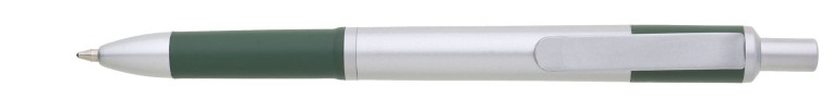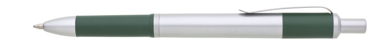 Propiska s matným stříbrným tělem a doplňky má tmavě zelený úchyt a zadní část těla. Náplň X20, modře píšící.