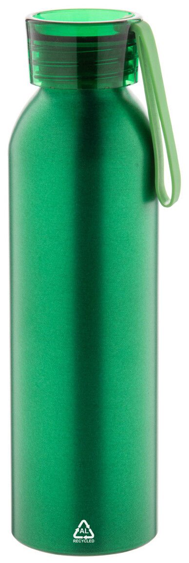 Láhev z recyklovaného hliníku s víčkem v odpovídající barvě a silikonovým popruhem, 600 ml.