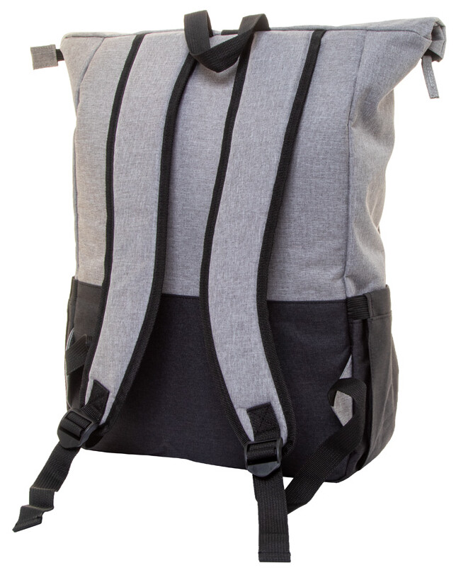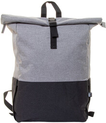 Dvoubarevný rolovací batoh z RPET se zapínáním na přezku, hlavní přihrádka na zip, polstrovaná přihrádka na notebook (15") a tablet (10"), boční kapsy, polstrovaná záda a ramenní popruhy. 300D RPET polyester s výrazným štítkem RPET.