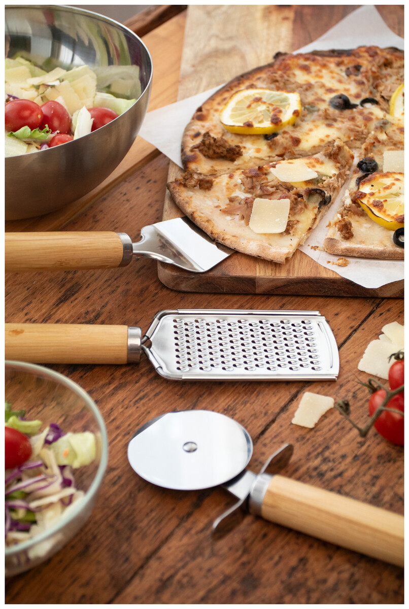 3dílná sada na servírování pizzy z nerezové oceli s bambusovou rukojetí v bavlněné taštičce se stahovací šňůrkou. Včetně struhadla na sýr, kráječe na pizzu a špachtle.