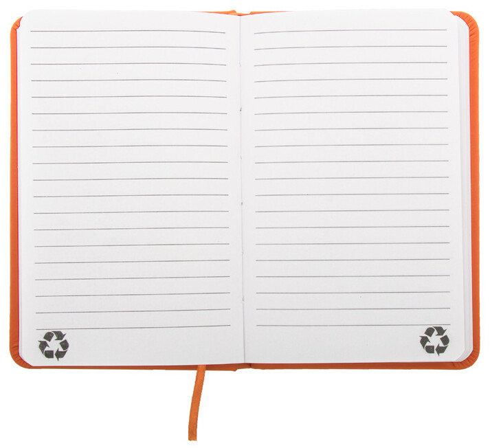 Blok potažený recyklovanou PU kůží se 100 linkovanými listy z recyklovaného papíru. Se záložkou v odpovídající barvě a gumičkou. Velikost A6.