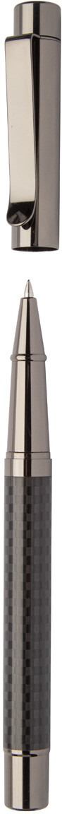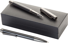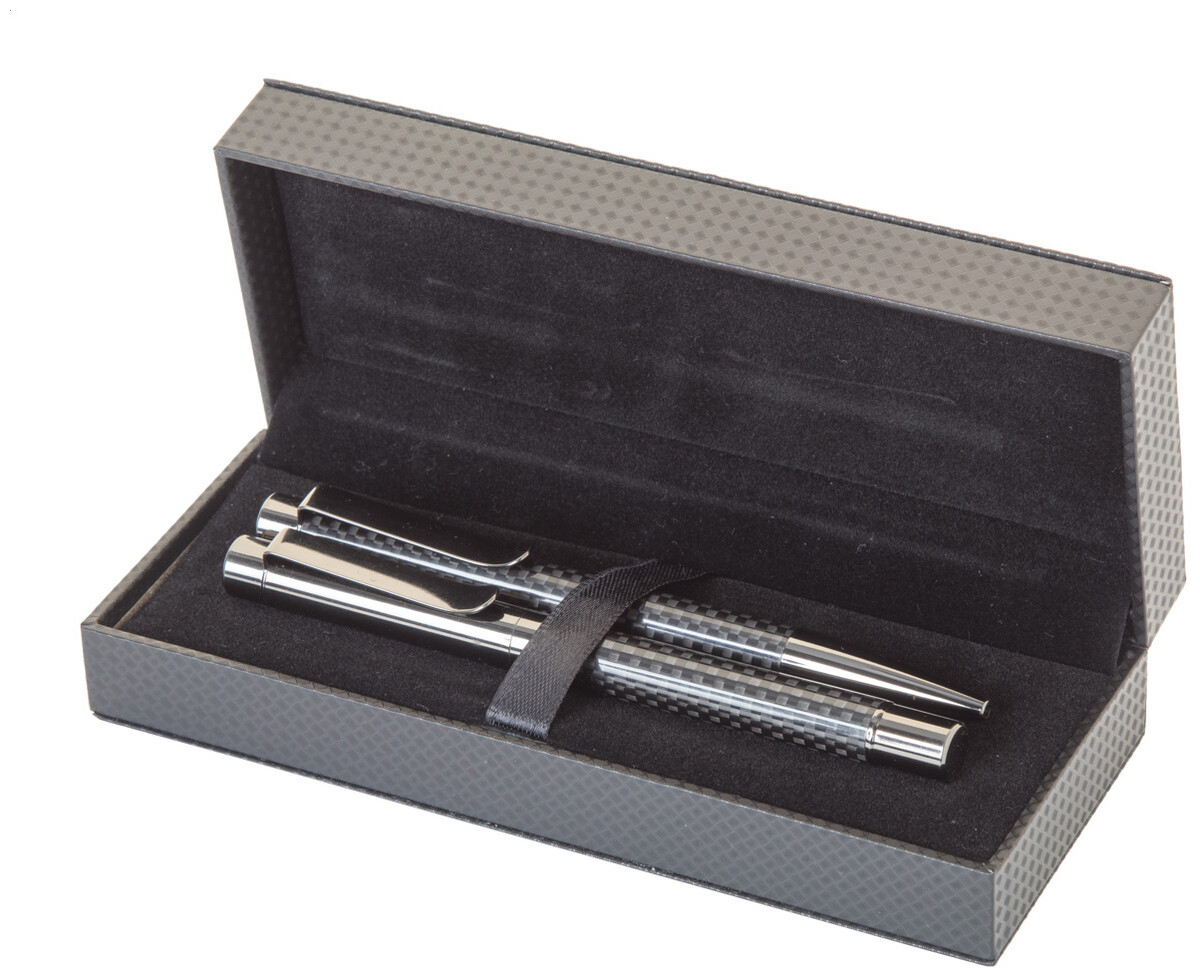Elegantní, kovová sada kuličkového pera a rolleru s karbonovým vzorovaným tubusem a díly z červeného kovu. V dárkové krabičce s karbonovým vzorem, s modrou náplní.