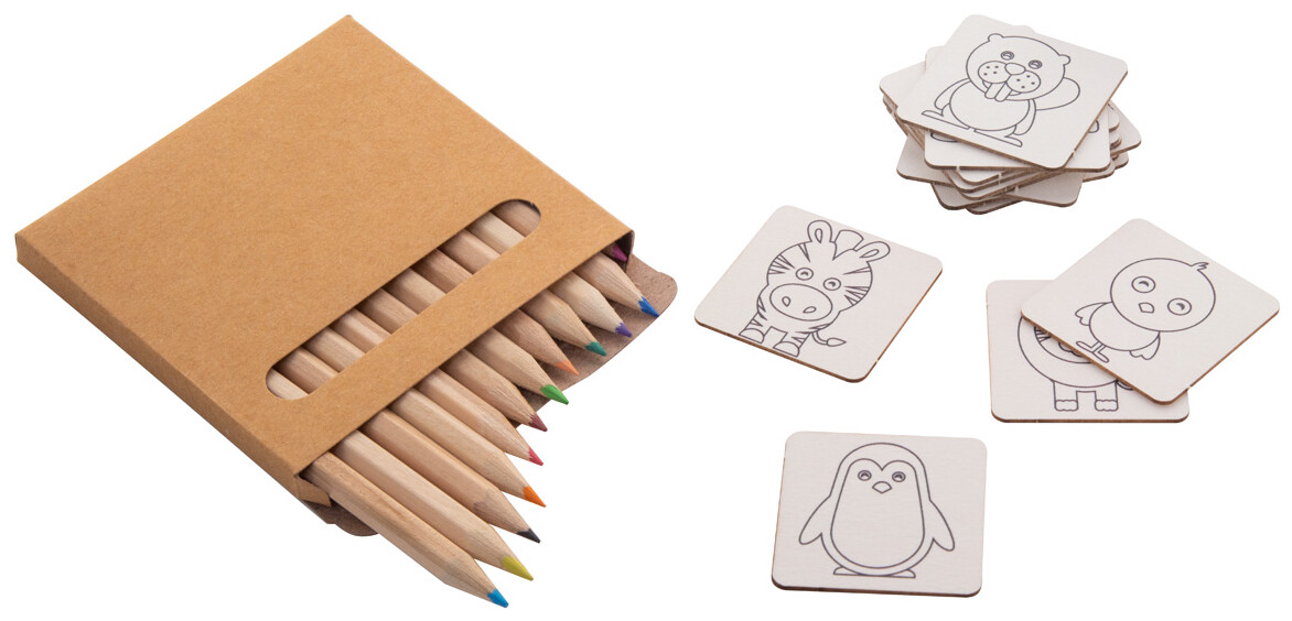 Vybarvovací pexeso v bavlněném pouzdře. Obsahuje tématické papírové pexeso (24 dílků) a dřevěné pastelky (12 ks) v papírové krabičce.