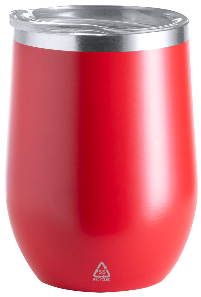 Dvoustěnný termo hrnek z recyklované nerezové oceli s plastovým víčkem na pití. 350 ml.