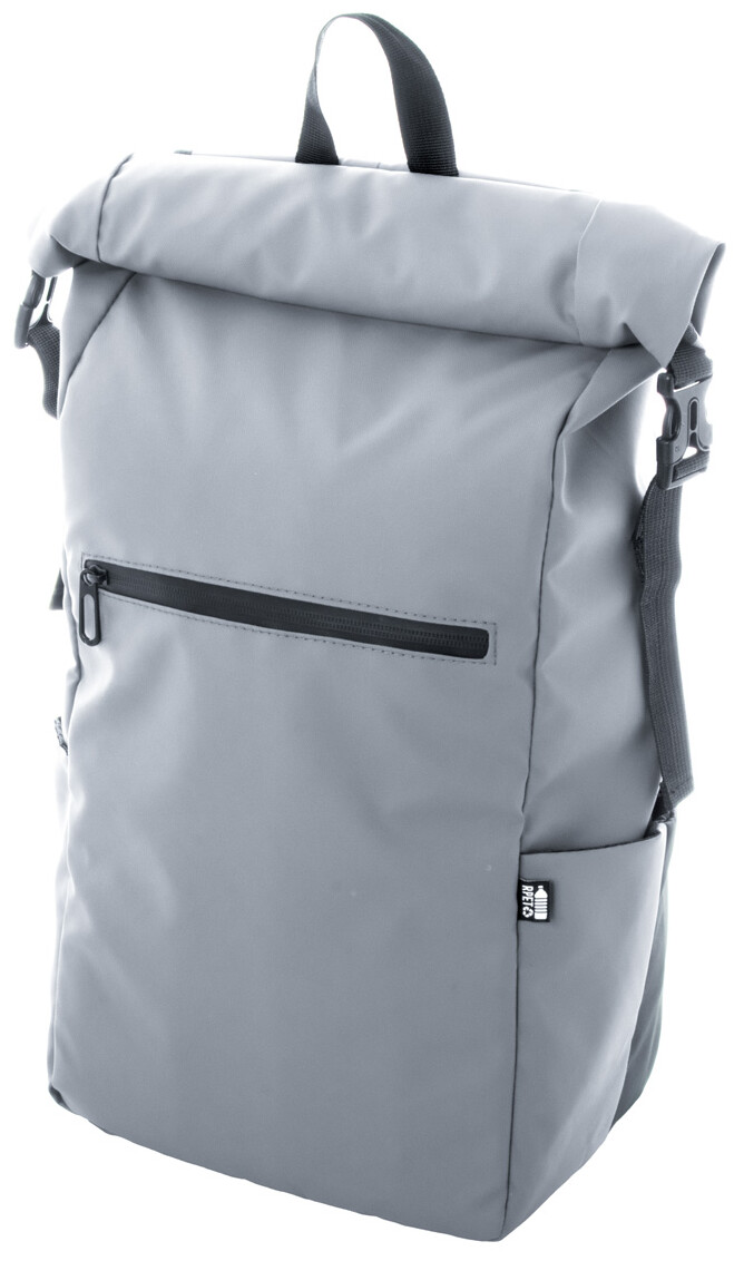 Vodotěsný rolovací batoh z RPET se zapínáním na přezku a suchý zip, polstrovaná přihrádka na notebook (16") a tablet (10"), přední kapsa na zip, boční kapsy, polstrovaná záda a ramenní popruhy. Polyester 600D RPET potažený PU, s výrazným štítkem RPET.