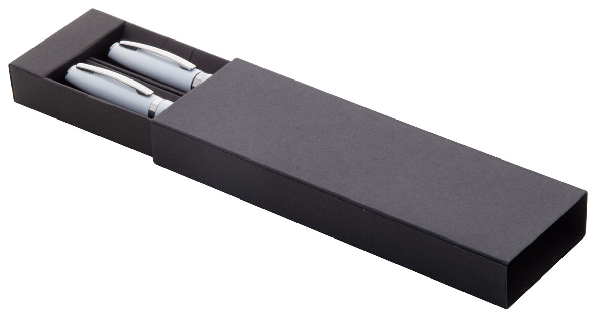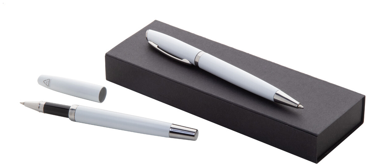 Sada per z recyklovaného hliníku s rollerem a kuličkovým perem v černé papírové dárkové krabičce. S modrou náplní.