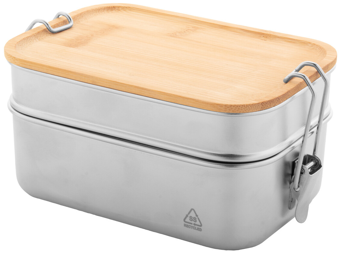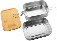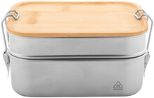 Box na jídlo z recyklované nerezové oceli s bambusovým víkem a bezpečným zavíráním na přezku. Se 2 přihrádkami o objemu 340 a 600 ml.