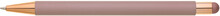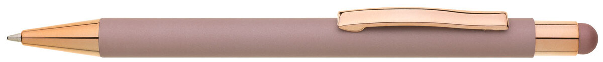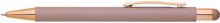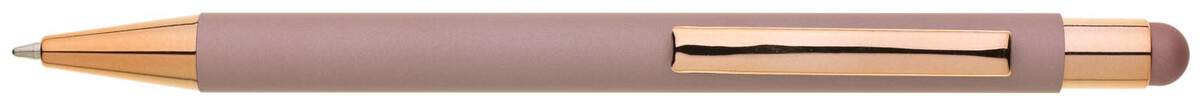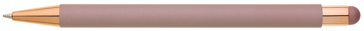 Růžové pogumované matné tělo propisky doplňují lesklé doplňky v barvě těla a matný touch konec. Logo po vylaserování je lesklé stříbrné. Velkoobsahová modře píšící náplň.