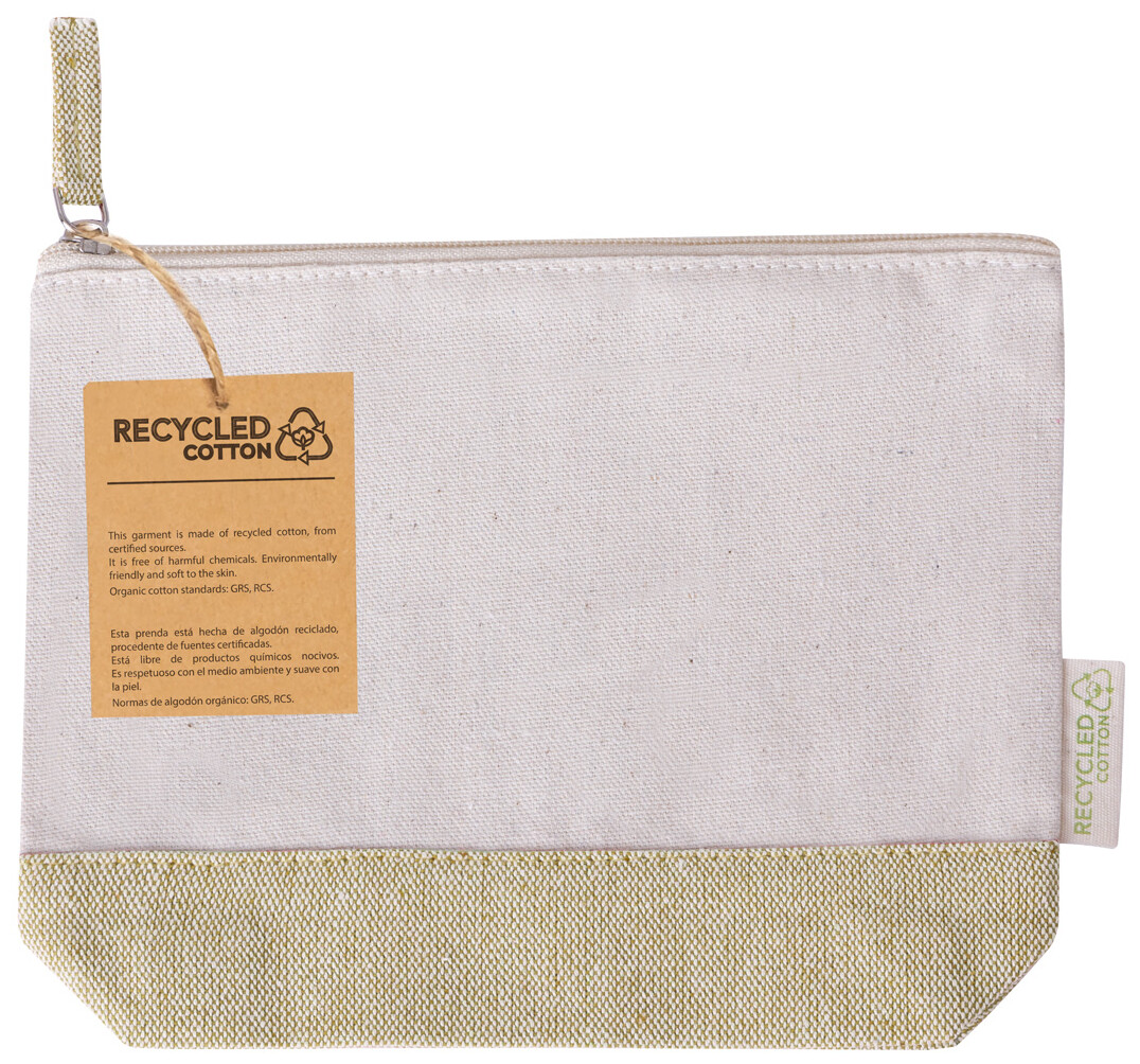 Dvoubarevná kosmetická taštička z recyklované bavlny na zip. 100% recyklovaná bavlna s výrazným štítkem z recyklované bavlny.