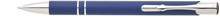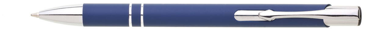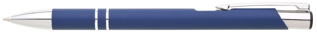 Hliníková propiska se stříbrnými doplňky a měkkým pogumovaným soft povrchem v modré barvě. Černě píšící.