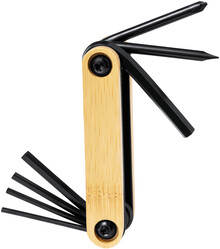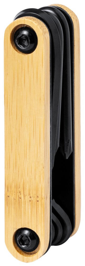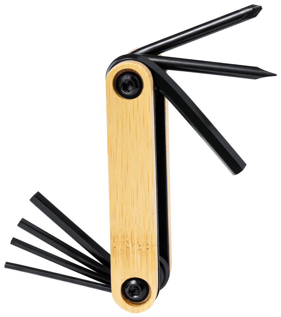 Víceúčelové nářadí z černé uhlíkové oceli s bambusovou rukojetí a 7 funkcemi (5 šestihranných klíčů, plochý a křížový šroubovák).