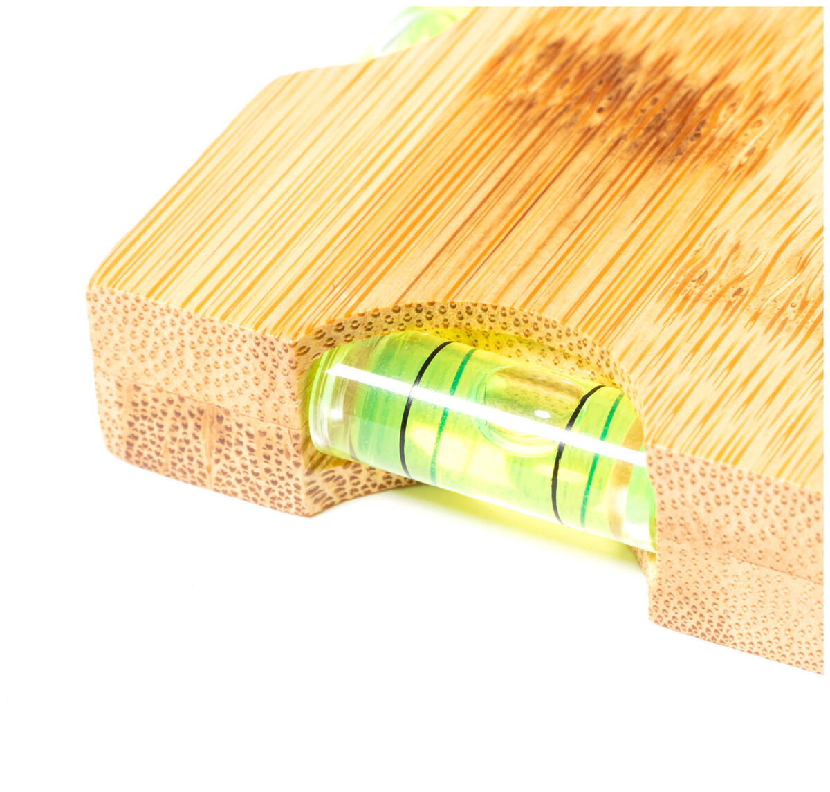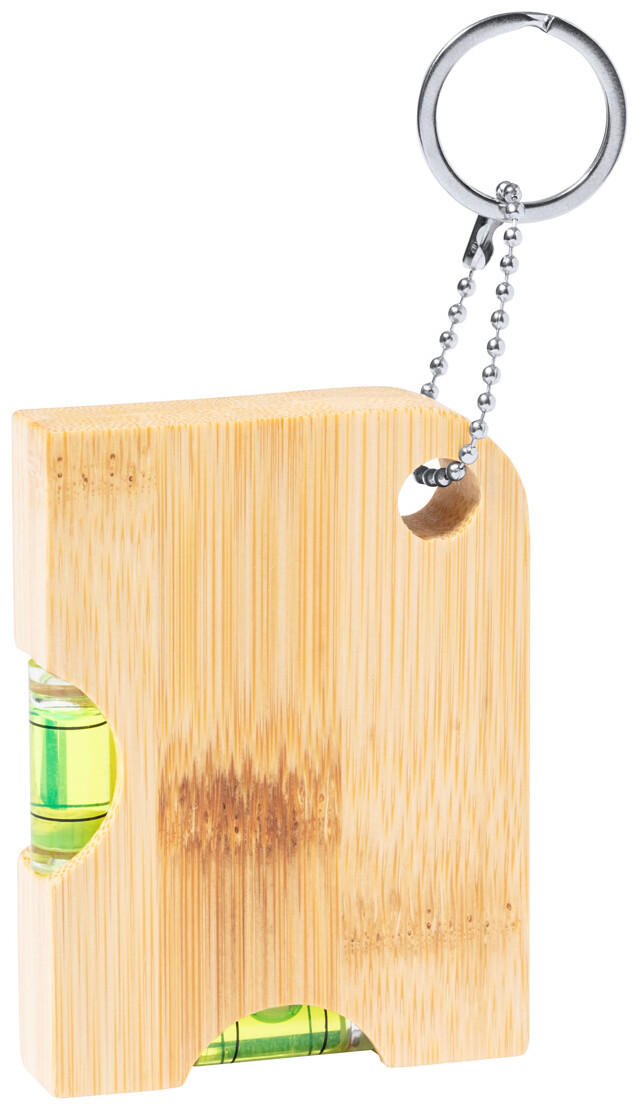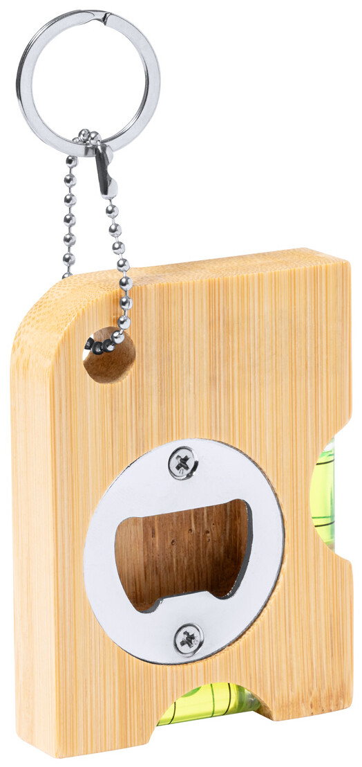 Multifunkční bambusový přívěsek na klíče s kovovým kroužkem, otvírákem na láhve a duální vodováhou.