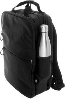 Vodotěsný batoh RPET se 2 přihrádkami na zip, 2 předními kapsami na zip, bočními kapsami a polstrovanou přihrádkou na notebook (16"). S popruhem na vozík, polstrovanými zády a ramenními popruhy. Polyester 600D RPET potažený PU, s výrazným štítkem RPET.