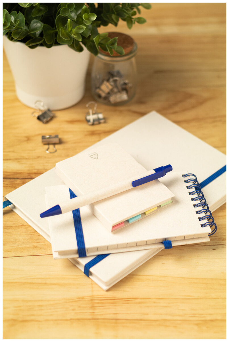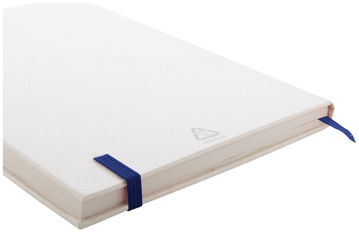Blok A5 z kartonu z recyklovaného mléka s pevnou vazbou, 80 linkovanými listy a elastickým páskem v odpovídající barvě.