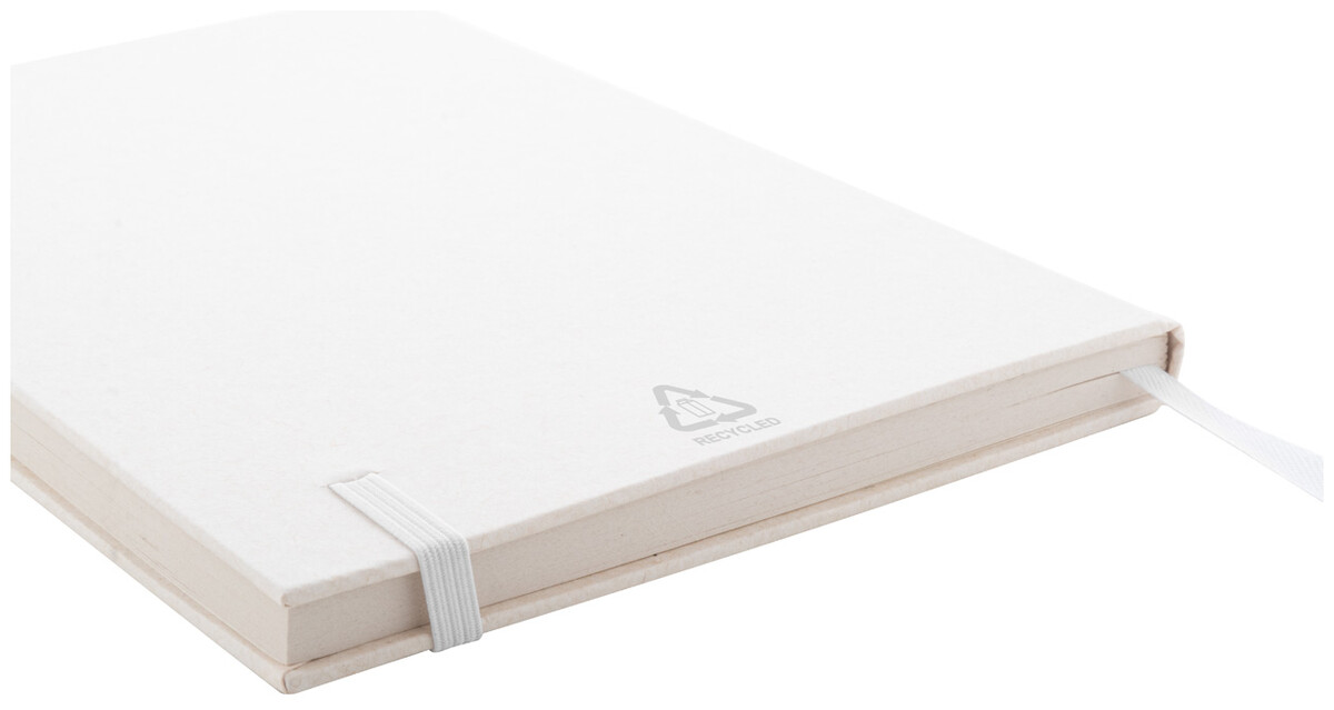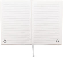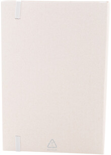 Blok A5 z kartonu z recyklovaného mléka s pevnou vazbou, 80 linkovanými listy a elastickým páskem v odpovídající barvě.