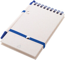 Spirálový blok A6 s deskami z recyklovaného z kartonu na mléko s pevnou vazbou a 70 linkovanými listy. Se spirálovými kroužky ve stejné barvě, gumičkou a poutkem na pero. Včetně recyklovaného kartonového papíru na mléko a recyklovaného ABS plastového kuličkového pera s modrou náplní.