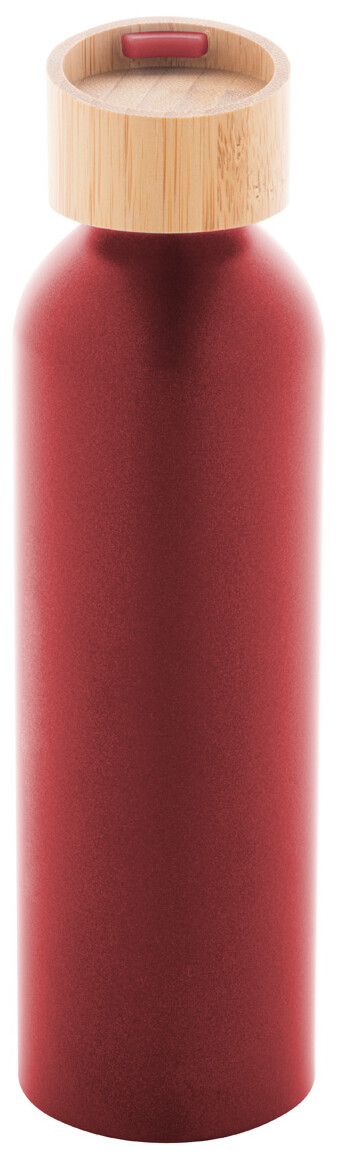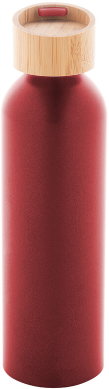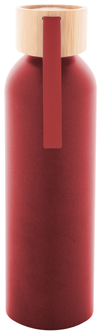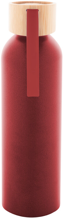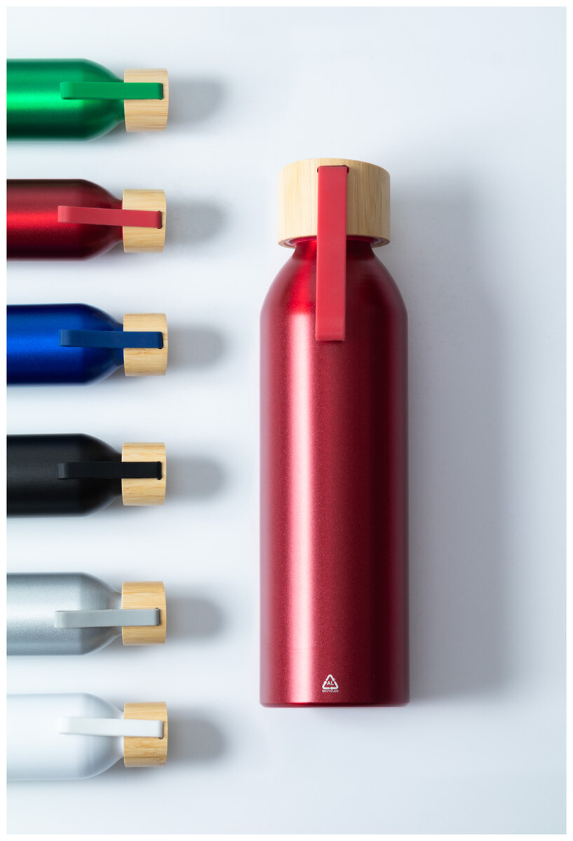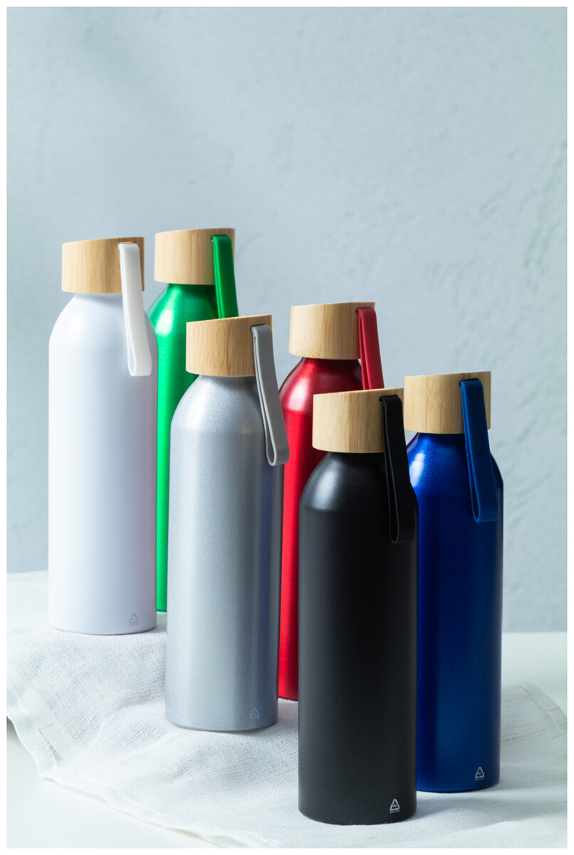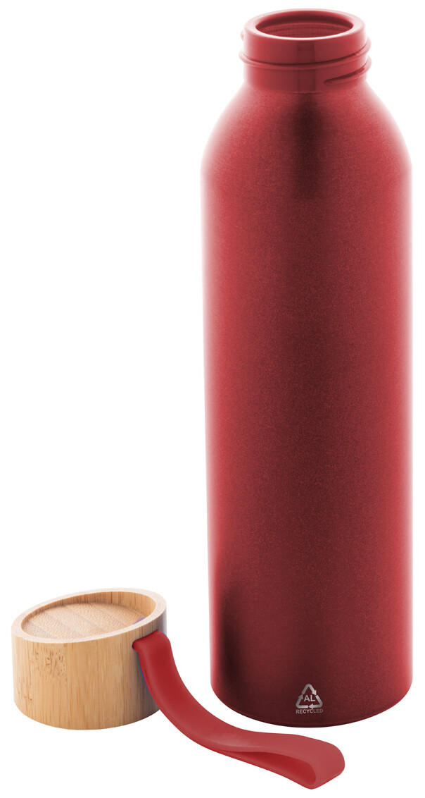 Láhev z recyklovaného hliníku s bambusovým víčkem a silikonovým popruhem v odpovídající barvě, 600 ml.