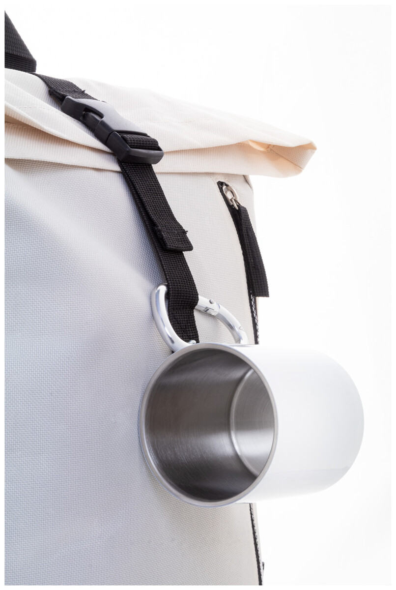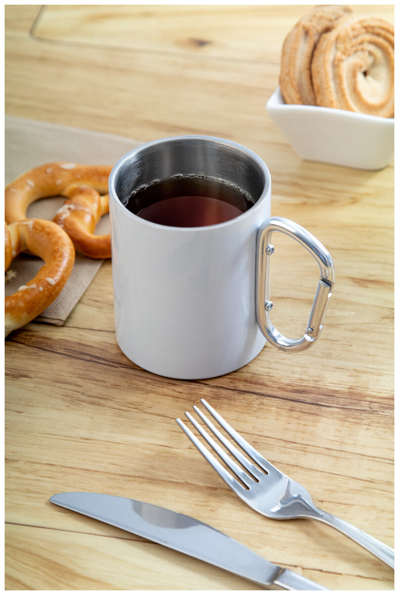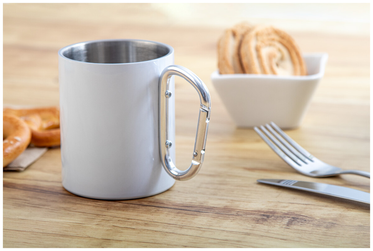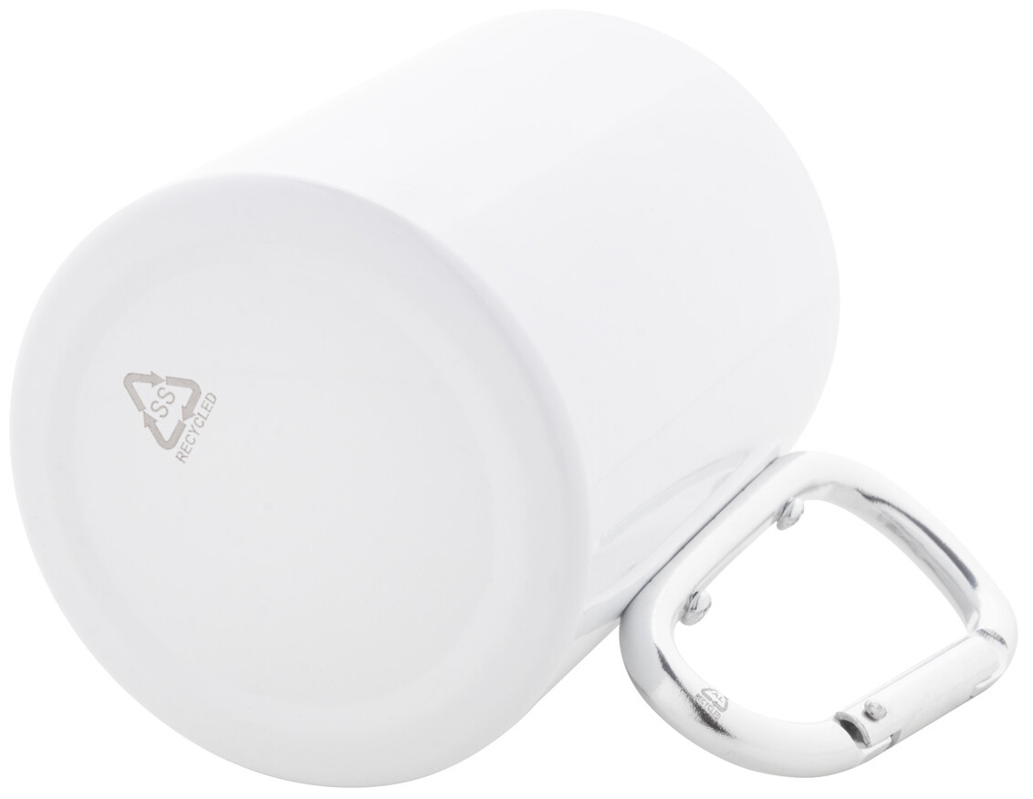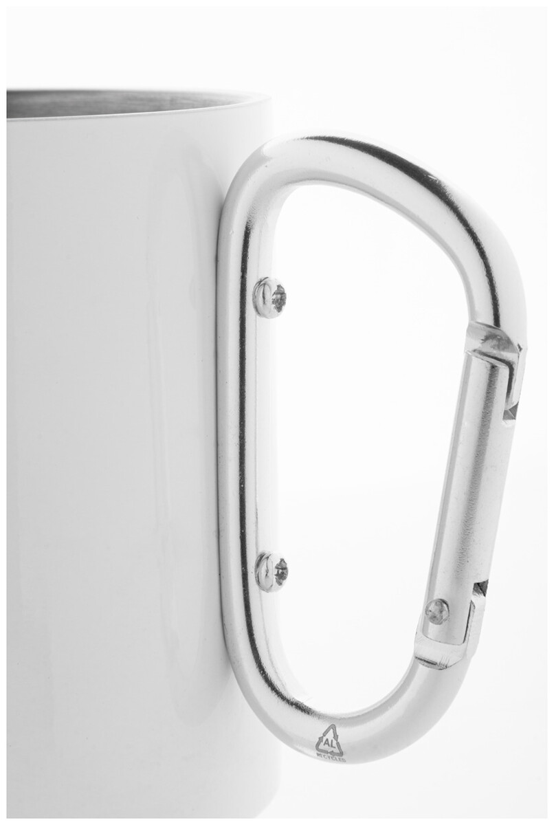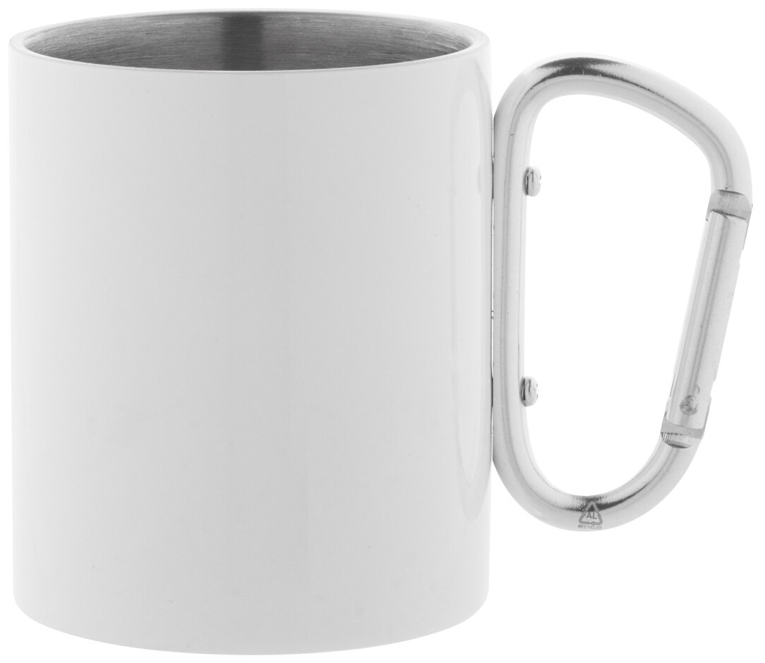 Dvoustěnný termo hrnek na sublimaci z recyklované nerezové oceli s karabinou z recyklovaného hliníku. 300 ml. V kraftové papírové krabici.