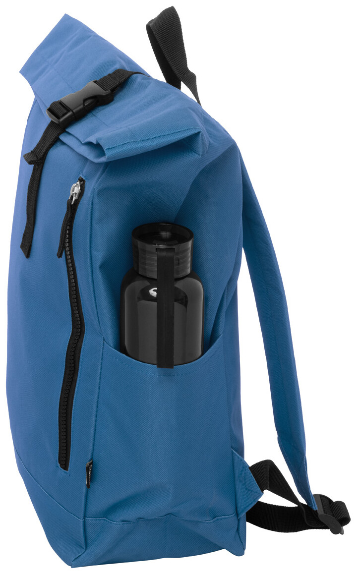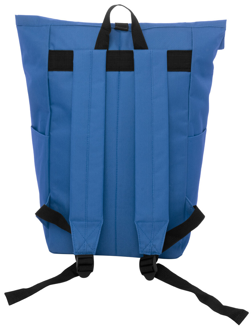 Rolovací batoh RPET se zapínáním na přezku, přihrádkou na notebook (14") a přední kapsou na zip. S polstrovanými zády a ramenními popruhy. Polyester 600D RPET s výrazným štítkem RPET.