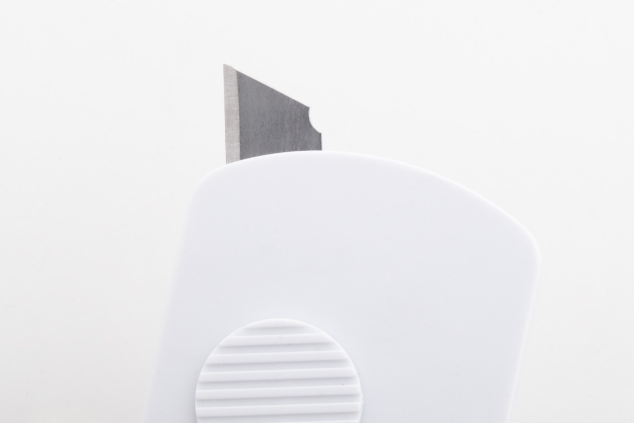 Nůž na papír z recyklovaného ABS plastu a nerezové oceli se samonavíjecí čepelí a kovovým kroužkem na klíče.