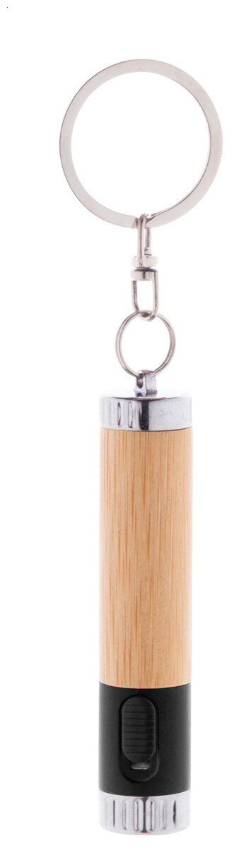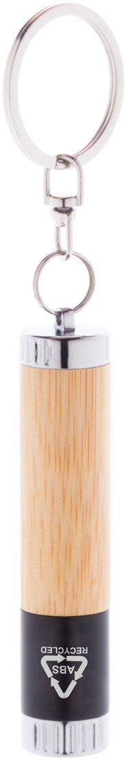 Mini svítilna z bambusu a recyklovaného ABS plastu s 1 LED a kovovým kroužkem na klíče. S knoflíkovou baterií.