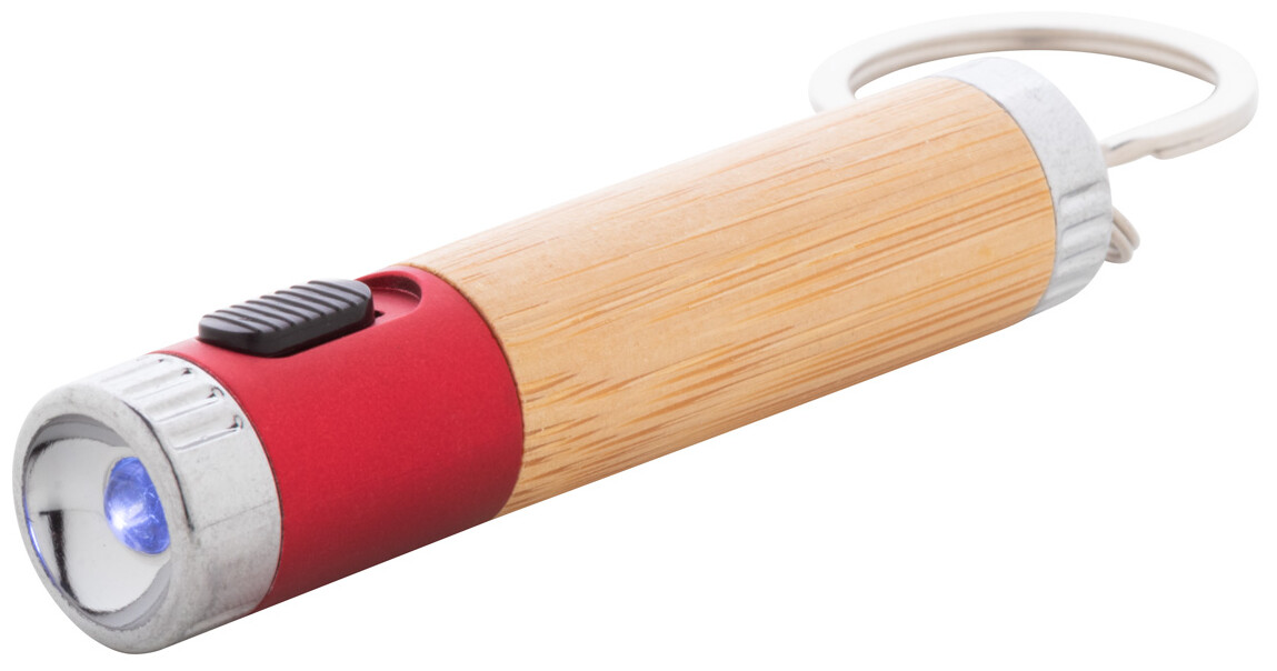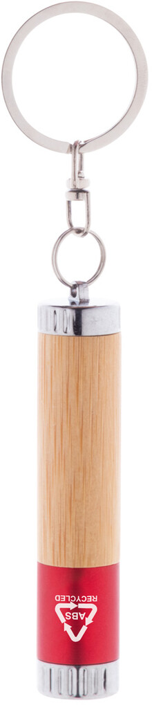 Mini svítilna z bambusu a recyklovaného ABS plastu s 1 LED a kovovým kroužkem na klíče. S knoflíkovou baterií.