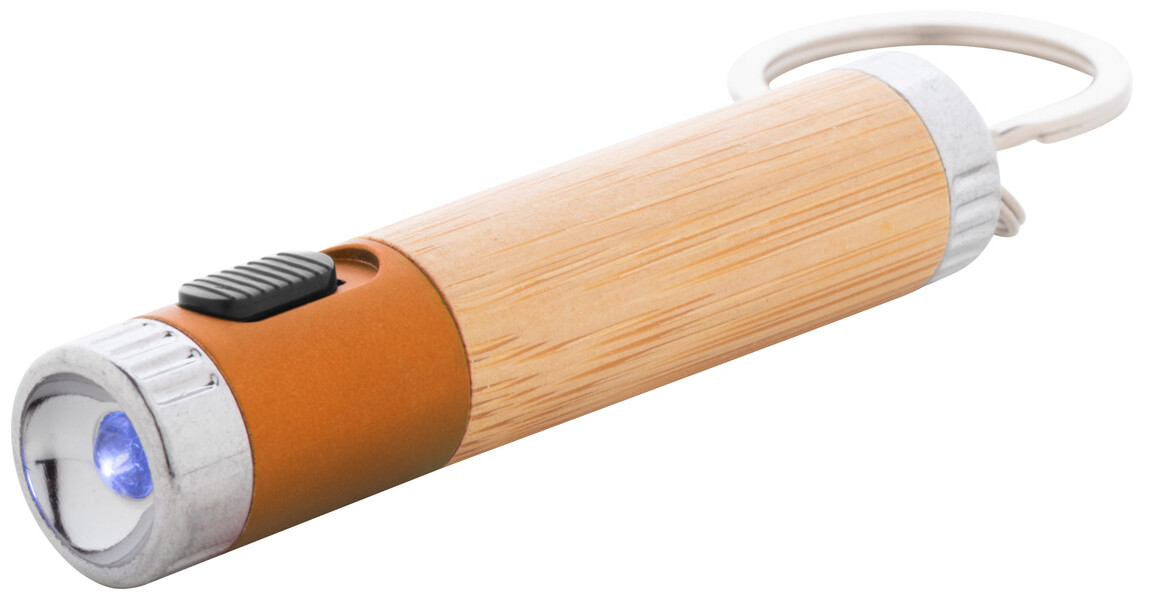 Mini svítilna z bambusu a recyklovaného ABS plastu s 1 LED a kovovým kroužkem na klíče. S knoflíkovou baterií.