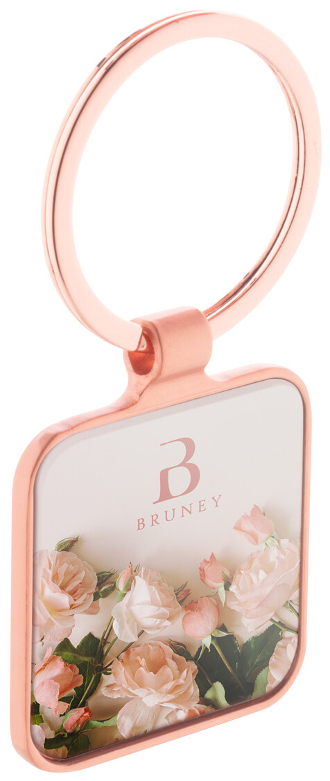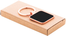 Kovový přívěsek na klíče čtvercového tvaru ve zlatém provedení s bronzovou destičkou. V kraftové papírové krabici.