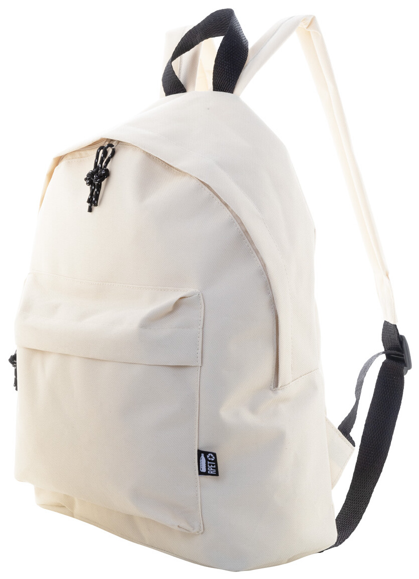 RPET batoh s hlavním prostorem na zip, přední kapsou na zip, polstrovanými zády a ramenními popruhy. Polyester 600D RPET, s výrazným štítkem RPET.