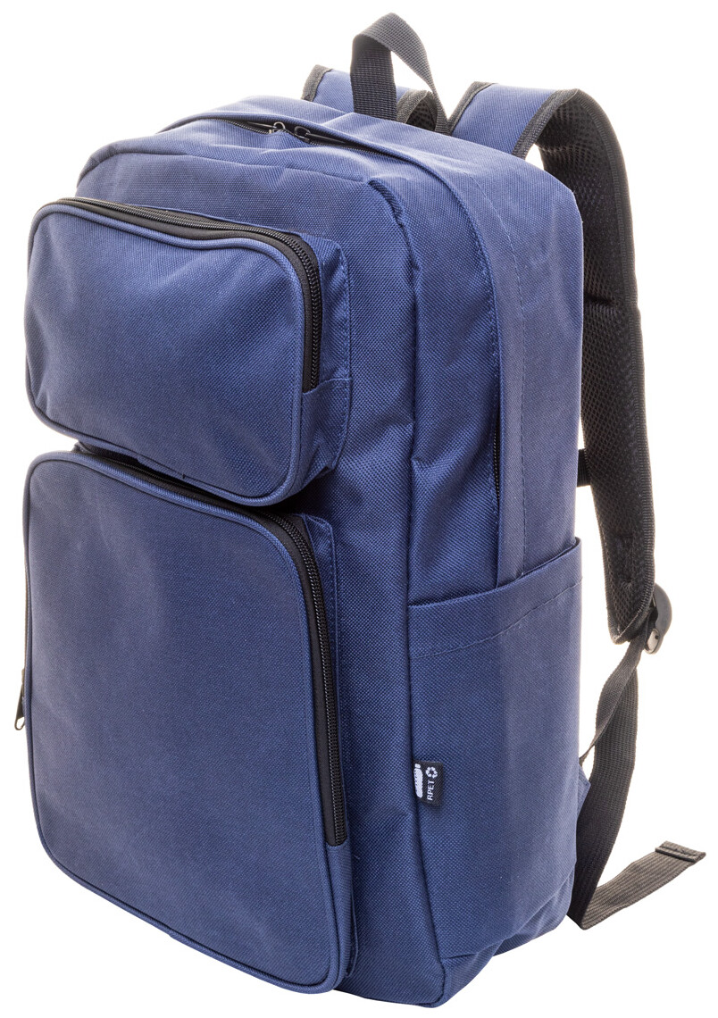Batoh RPET s hlavním oddílem na zip, 2 předními kapsami na zip, bočními kapsami a polstrovanou přihrádkou na notebook (15") a tablet (10") S polstrovanými zády a ramenními popruhy. Polyester 600D RPET, s výrazným štítkem RPET.