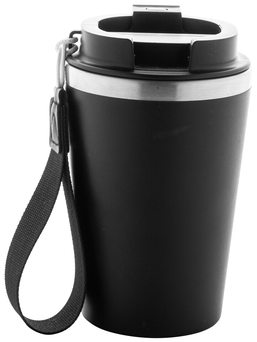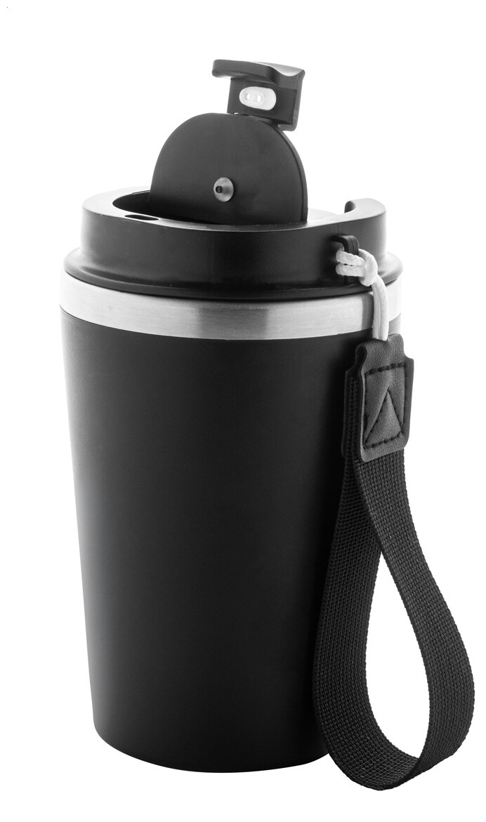 Dvoustěnný termo hrnek z recyklované nerezové oceli s vnějším PP plastem a víčkem na pití. S popruhem na přenášení RPET. 350 ml.