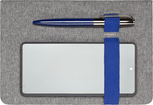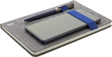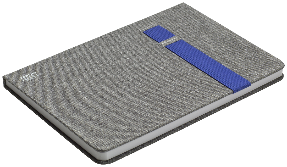 Poznámkový zápisník A5 v deskách z modrého RPET má 80 linkovaných listů. Blok má poutko na propisku a také na mobilní telefon.