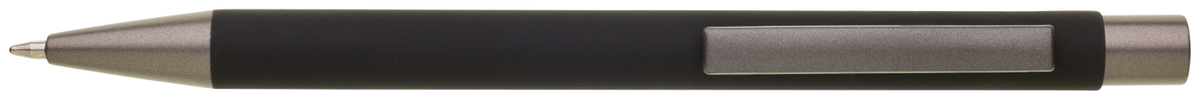 Kovová propiska CAGERI SOFT s hnědo-černými doplňky, s černým pogumovaným povrchem. Velkoobsahová modrá náplň.