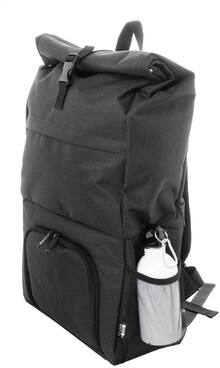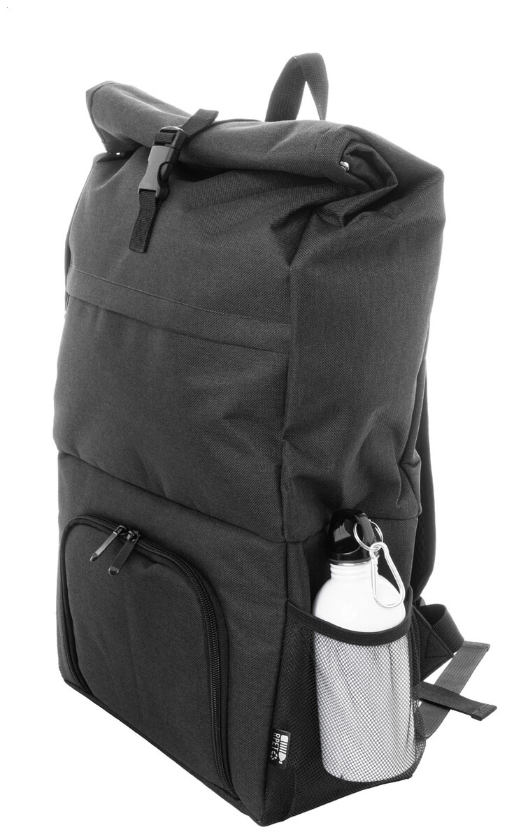 Rolltop RPET chladící batoh s PEVA polstrovanou chladicí přihrádkou na zip na jídlo. S hlavní přihrádkou na sponu, přední kapsou na zip, bočními síťovanými kapsami a polstrovanými ramenními popruhy. 600D RPET polyester s výrazným štítkem RPET.
