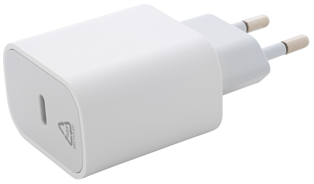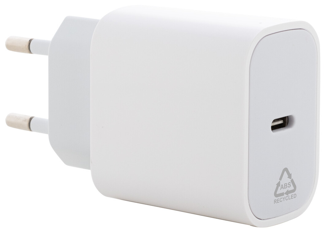 Recyklovaná rychlonabíjecí USB nástěnná nabíječka z ABS 1 port USB-C. Podporuje technologii rychlého nabíjení (PD20W / QC3.0). S 2-pólovou evropskou zástrčkou.