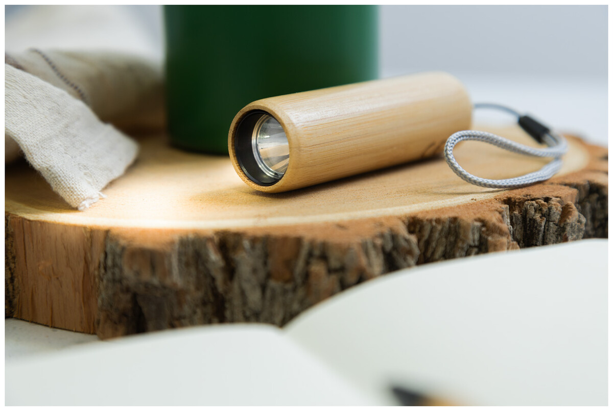 Bambusová baterka s vestavěnou USB dobíjecí baterií (320 mAh), 1 LED světlem a poutkem na přenášení. Se 3 režimy svícení. Včetně USB nabíjecího kabelu.