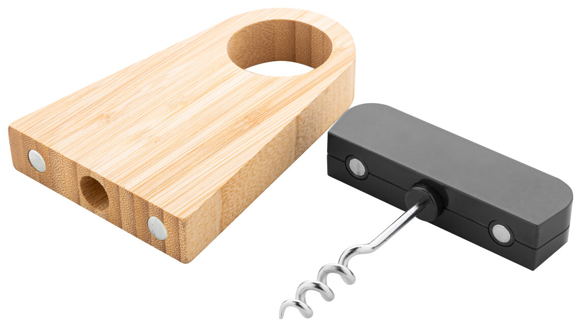 Bambusový a recyklovaný ABS držák na víno s vývrtkou z nerezové oceli.